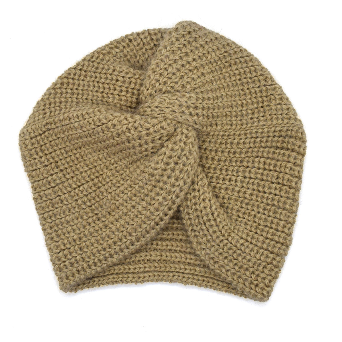 Handmade rib-knit khaki turban for girls made of 100% baby alpaca.