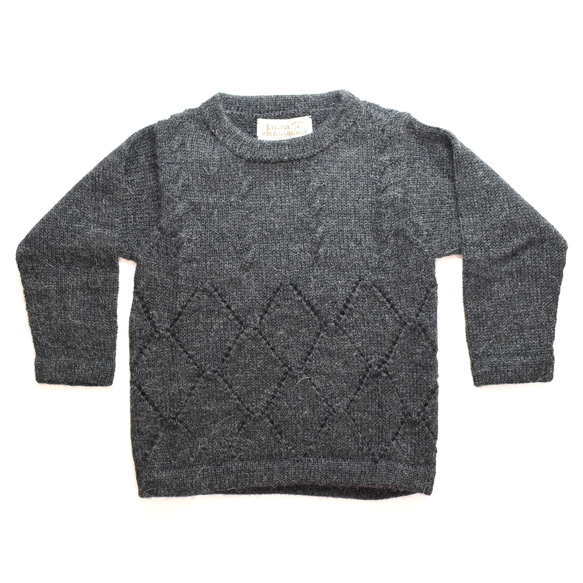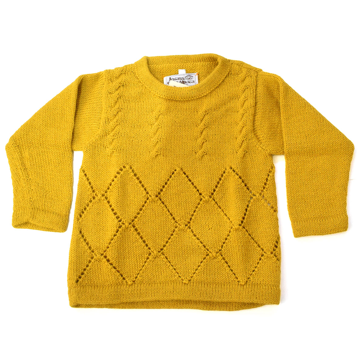 Crew neck jersey for boys made of 100% baby alpaca fiber. This lovely jersey has a little rhombus at the bottom of the jersey. The colors of these jerseys are amber, maroon, anthracite gray, peach, and red.