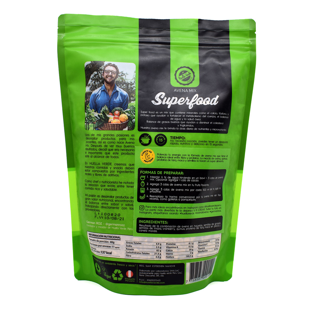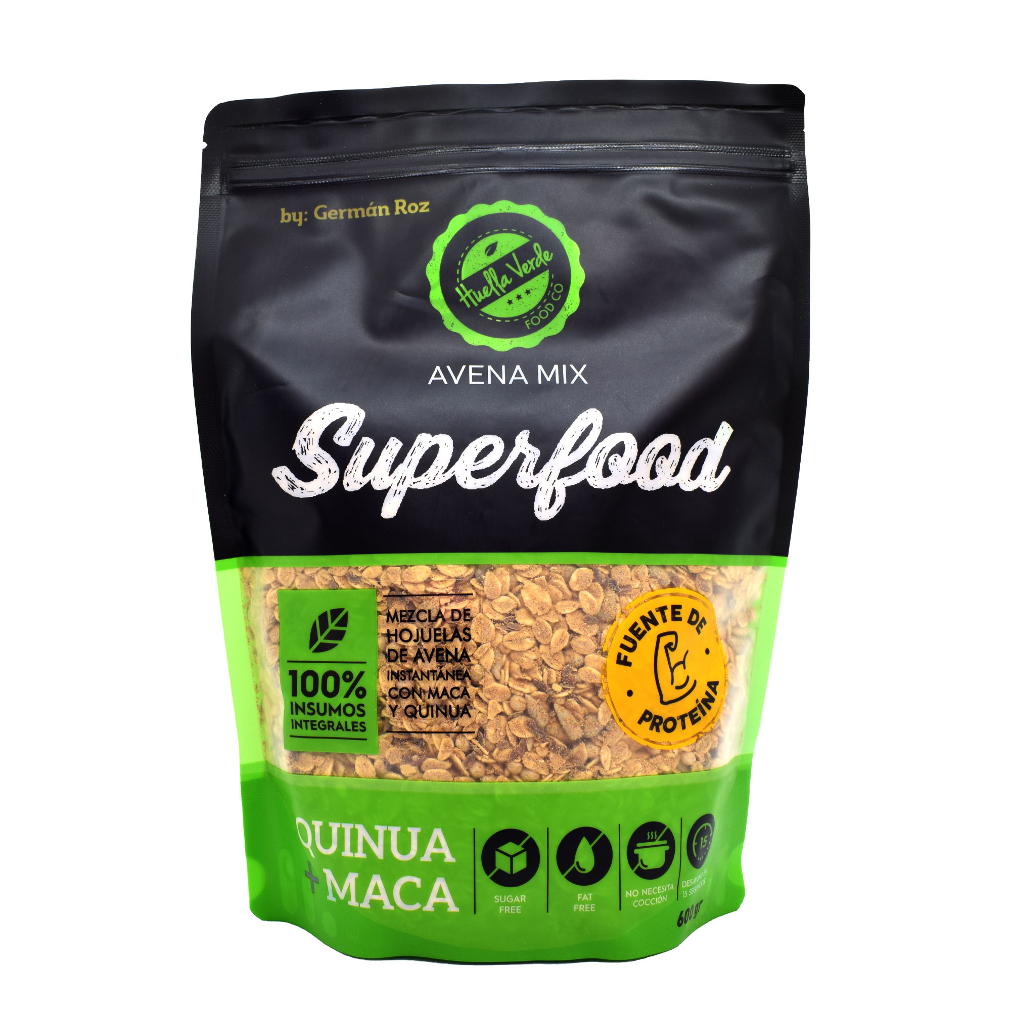 A mix of instant rolled oats with maca and quinoa. Superfood rolled oat mix contains minerals such as calcium, phosphorus, and potassium that help strengthen the body's metabolism, water balance, and bone health. Also, it has a balance of good fats that help lower cholesterol and triglycerides. This mix provides a daily dose of nutrients and micronutrients.