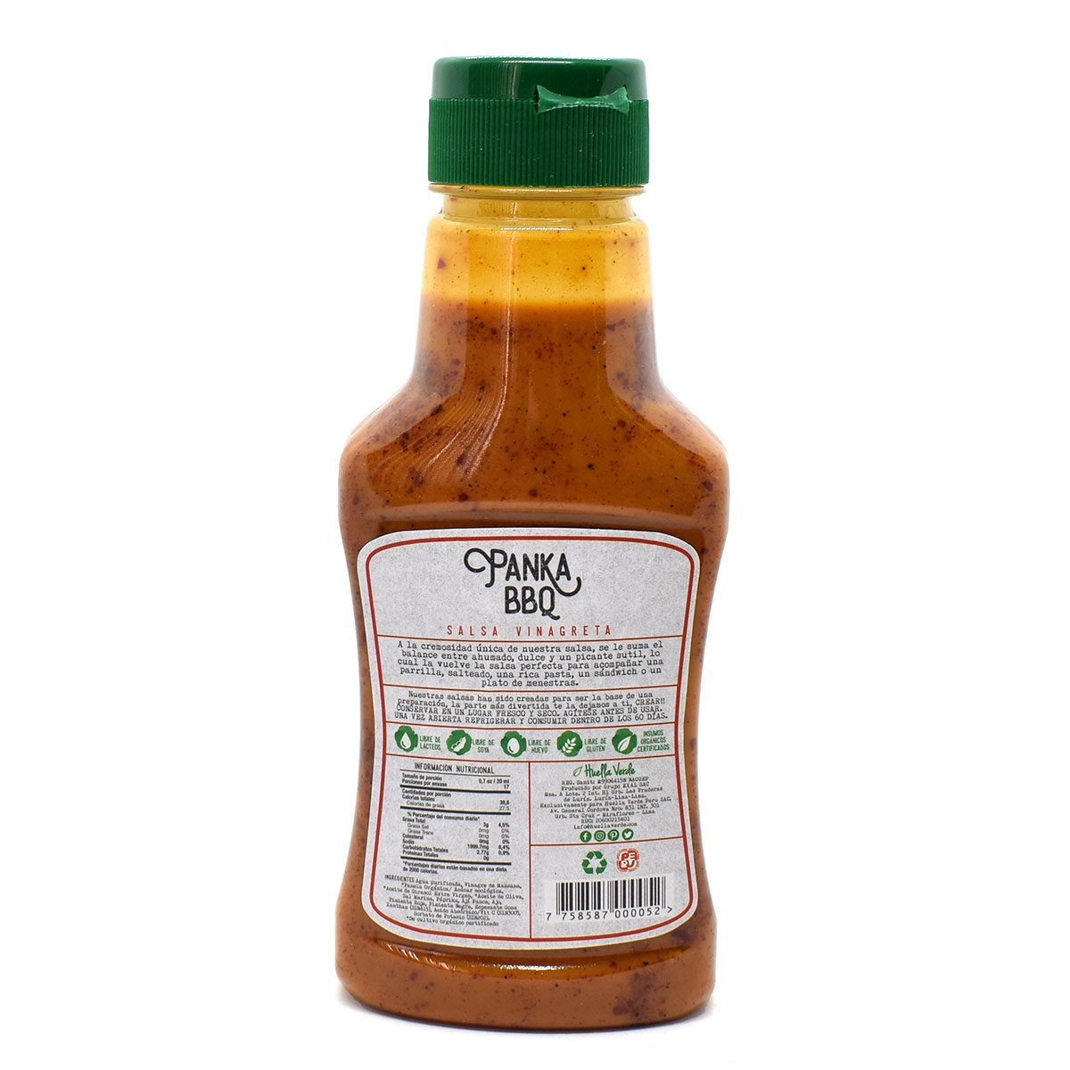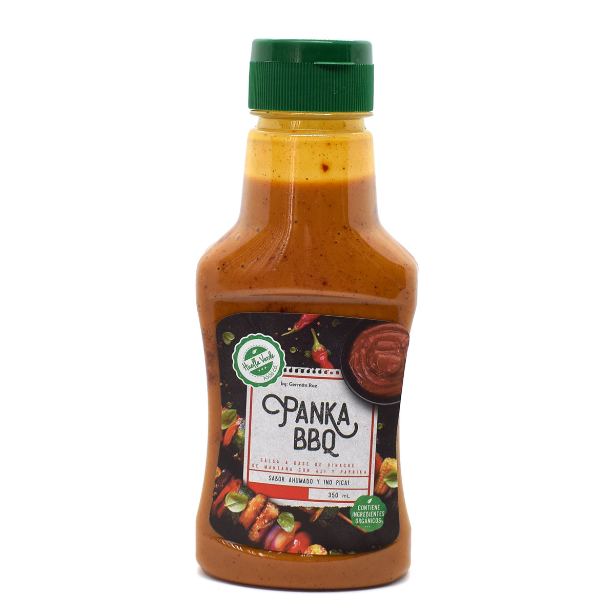 Panka Bbq sauce, 11.83 fl oz (350 ml): Purified water, apple cider vinegar, *organic panela, *extra virgin sunflower oil, *olive oil, sea salt, paprika, panca pepper, garlic, red pepper, black pepper, thickener, xanthan gum (SIN415), ascorbic acid/Vit. C (SIN300), and potassium sorbate (SIN202)