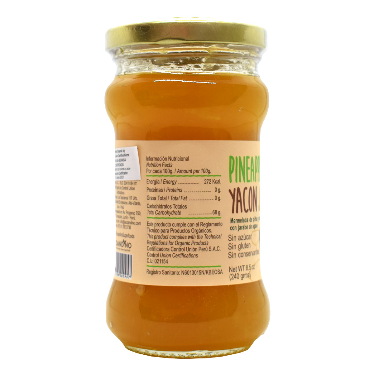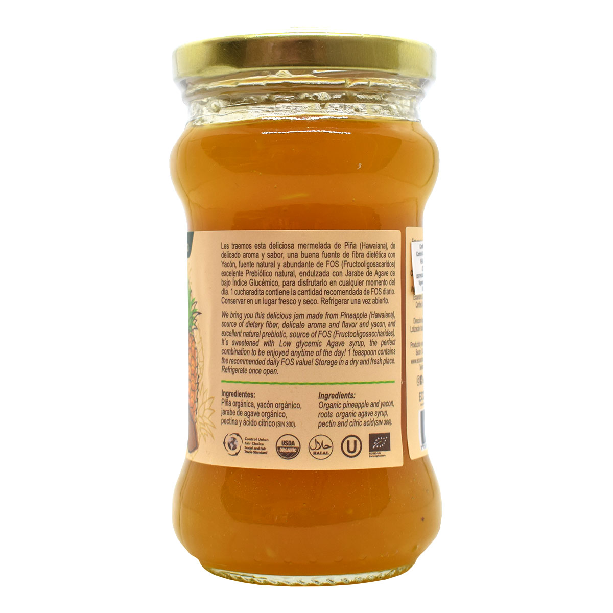 Delicious jam made of pineapple (Hawaina variety) with a delicate aroma and flavor. The main ingredient is a good source of dietary fiber. This jam is also made with yacon, a natural and rich source of FOS (fructooligosaccharides). In addition, it is an excellent natural prebiotic sweetened with low glycemic index agave syrup to be enjoyed at any time of the day. Pineapple increases immunity helps digestion, and has a high content of vitamin C.