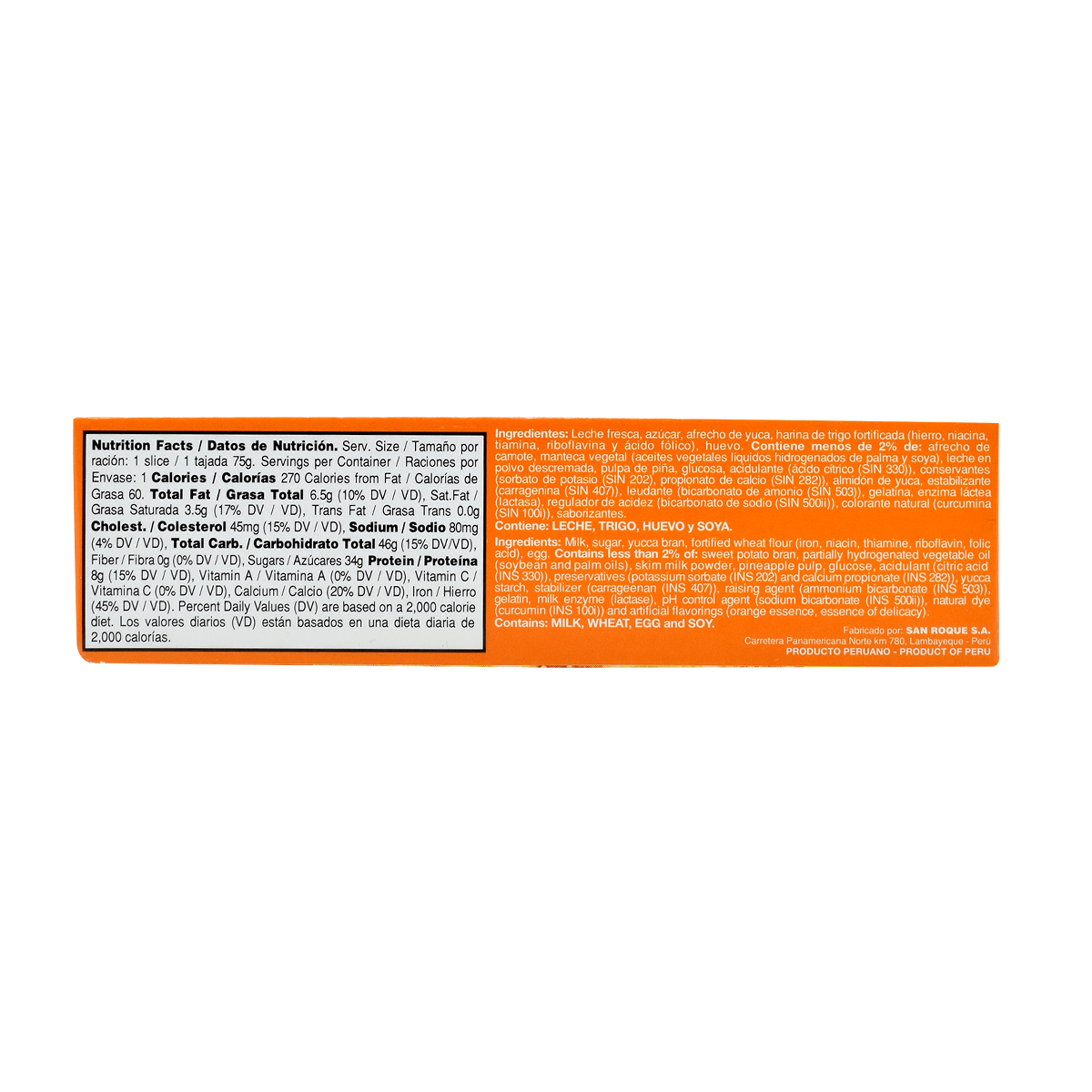 Milk, sugar, yucca bran, fortified wheat flour (iron, niacin, thiamine, riboflavin, and folic acid), and egg Contains less than 2% of: sweet potato bran, partially hydrogenated vegetable oil (palm and soy), skim milk powder, pineapple pulp, glucose, acidulant (citric acid (ISN 330)), preservatives (potassium sorbate (ISN 202), and calcium propionate (ISN 282)), yucca starch, stabilizer (carrageenan (ISN 407)), raising agent (ammonium bicarbonate (ISN 503)), gelatin, milk enzyme (lactase), pH control agent (sodium bicarbonate (ISN 500ii)), natural dye (curcumin (ISN 100i)), and artificial flavorings (orange essence and essence of delicacy)