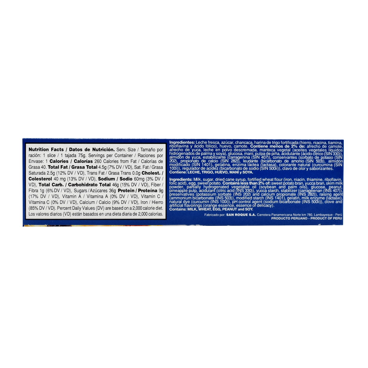 Milk, sugar, dried cane syrup, fortified wheat flour (iron, niacin, thiamine, riboflavin, and folic acid), egg, and sweet potato. Contains less than 2% of: sweet potato bran, yucca bran, skim milk powder, partially hydrogenated vegetable oil (palm and soy), glucose, peanut, pineapple pulp, acidulant (citric acid (ISN 330)), yucca starch, stabilizer (carrageenan (ISN 407)), preservatives (potassium sorbate (ISN 202) and calcium propionate (ISN 282)), raising agent (ammonium bicarbonate (ISN 503)), modified starch (ISN 1401), gelatin, milk enzyme (lactase), natural dye (curcumin (ISN 100i)), pH control agent (sodium bicarbonate (ISN 500ii)), clove, and artificial flavorings (orange essence and essence of delicacy)