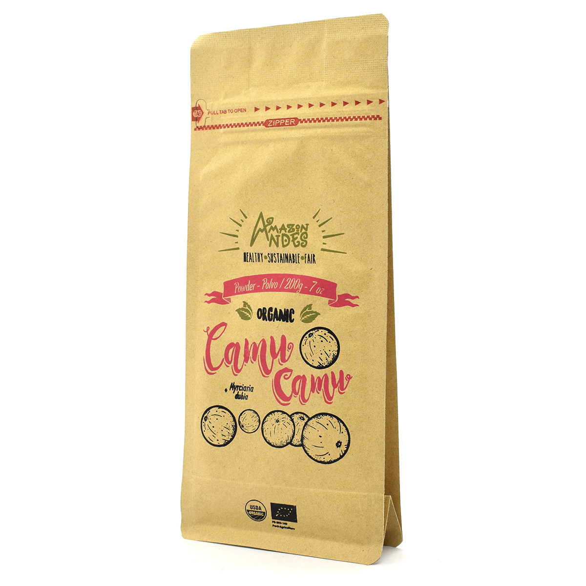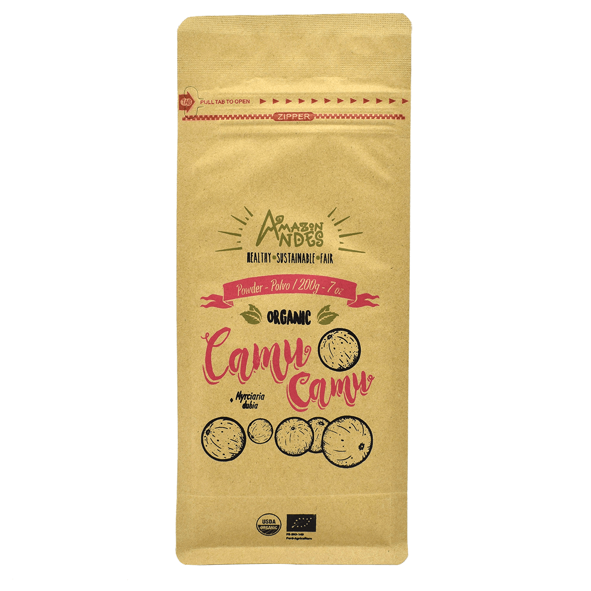 Myrciaria dubia M.H.K) is an Amazon superfruit highly valued for containing 30–60 times more vitamin C than oranges. Also, it contains a wide range of phytonutrients such as antioxidants, amino acids, vitamins, and minerals, making it a great ally of our nutrition. This fruit grows in the shores of Peruvian valleys, such as Ucayali, Marañon, Napo, Tigre, Curaray, Yavari, and Tahuayo. Organic camu camu powder is obtained through the selection of this fruit. After that, camu camu is washed, disinfected (following an organic process), pulped, cut, dried, ground, sieved, and packaged in a way that all its biological properties aren’t lost.
