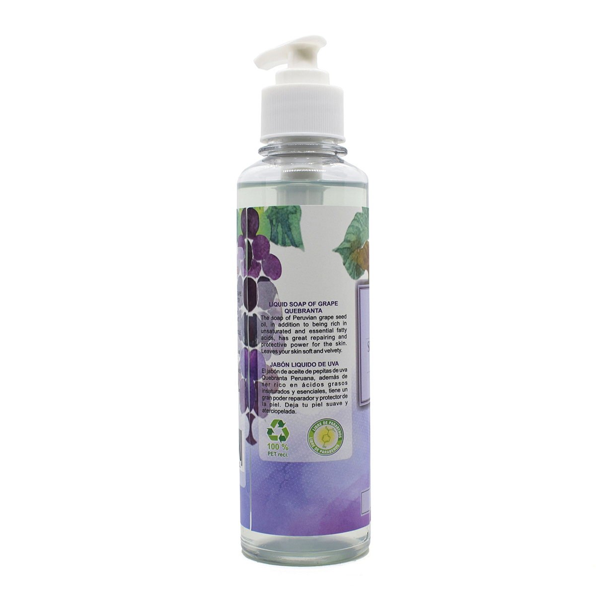 Grapeseed oil soap is made of Quebrada grape, a variety of Peruvian grape. Also, it is rich in unsaturated and essential fatty acids. It has a repair and protective power for the skin. Leaves your skin soft and velvety. INGREDIENTS Deionized water, glycerin, grapeseed oil, grapeseed emulsion, and microcare db RECOMMENDATION AND SUGGESTED USAGE: