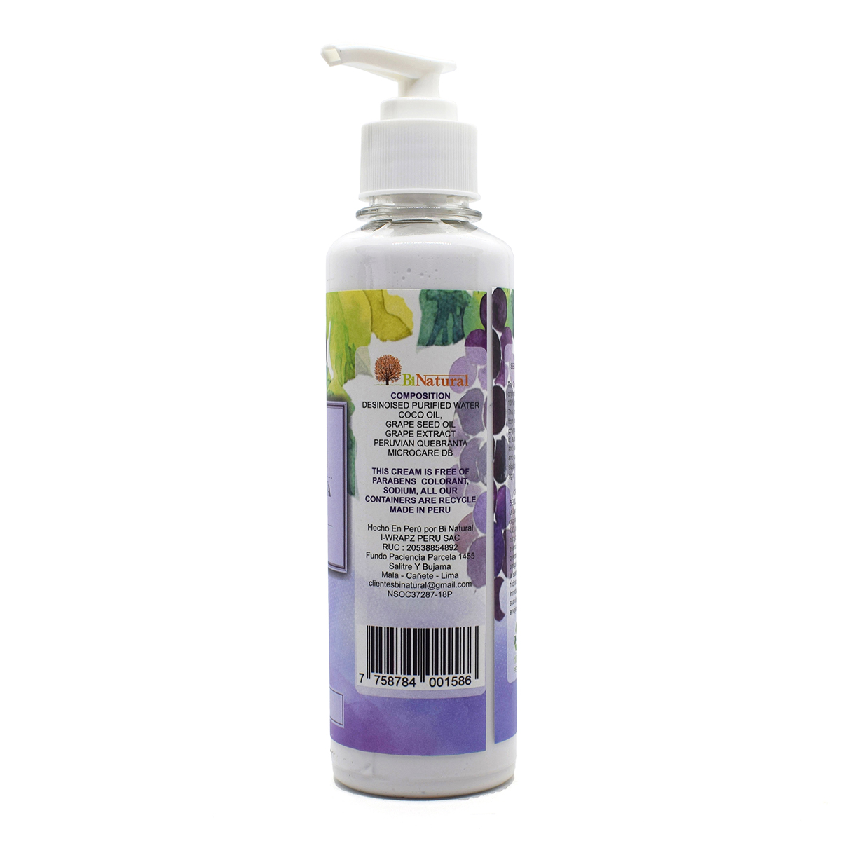 The Quebrada grape is a grape variety native to Peru. This fruit is 100% rich in natural resveratrol. Besides, this cream contains grapeseed essential oil that has properties such as polyphenols, vitamin E, and omega 6. These properties protect the elastin and collagen of the skin, hydrate and nourish the skin immediately, providing elasticity and softness which helps prevent aging. INGREDIENTS Deionized water, coconut oil, grapeseed oil, Quebranta grape extract, and microcare db RECOMMENDATION AND SUGGESTED USAGE: