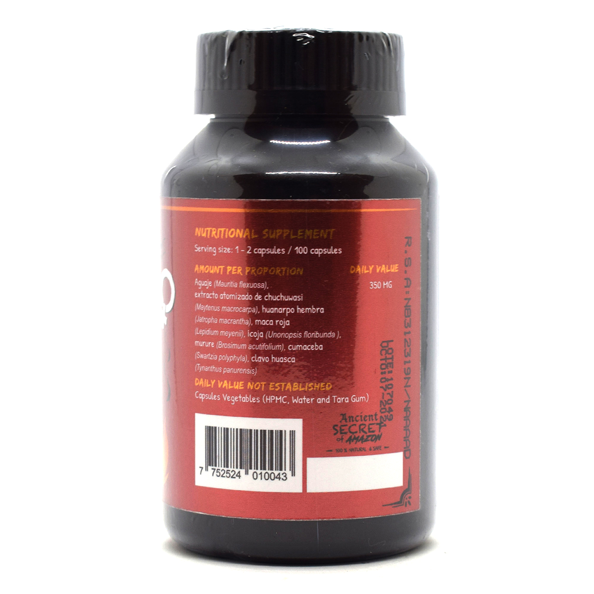 Aguaje powder, atomized extract of 7 roots (chuchuwasi, hanarpo hembra, red maca, icoja, murure, cumaceba, and clavo huasca), and vegetable capsule