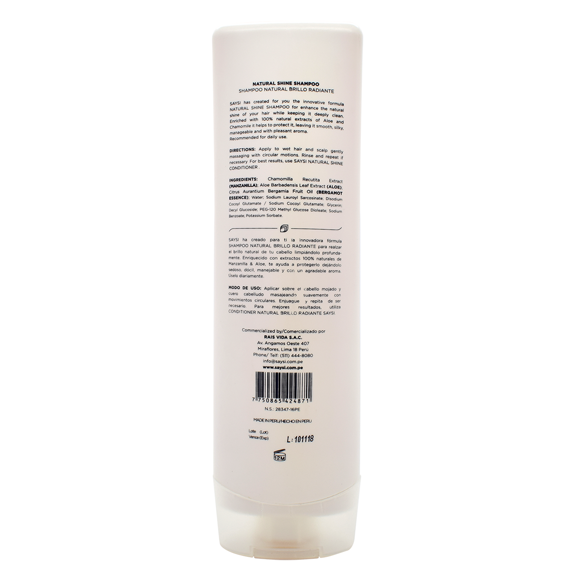 Aloe vera is a plant that many people in Peru use for the medicinal and healing properties that are attributed to it. The usage of this plant backs to human origins. Additionally, chamomile is an herb known for its digestive benefits. Although, it has cosmetic benefits to obtain a natural brightness in the hair. Saysi has created for you the innovative formula Natural Shine Shampoo for enhance the natural shine of your hair while keeping it deeply clean. Enriched with 100% natural extracts of chamomile and aloe, this shampoo helps to protect your hair leaving it smooth, silky, and manageable and with a pleasant aroma.