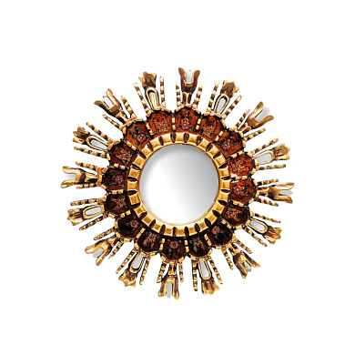 Round mirror with carved rays and glass painted on the reverse, mirror inlays and laminated in bronze leaf (gilt) and duco pasted on the back 100% HANDMADE
