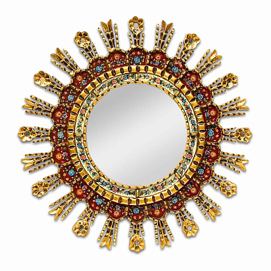 Round mirror and glass painted on the reverse, carved wooden rays, laminated in bronze leaf (gilt) and duco pasted on the back 100% HANDMADE