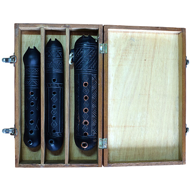 Traditional ceramic quena from the Chincha culture 1100 - 1400 AD. It has 5 holes at the front and one at the back. The "qena" or "qina" is a word from the Aymara language that translates as a pierced object in allusion to the finger holes it presents. It is a flute that has a window, wrist, or bezel on the edge of the mouthpiece. The performer directs the air directly over the notch with the lower lip to produce the sound. Three specimens were found in a tomb of measures: small, medium, and large. They had the belief that music transcended death and this should accompany it, that is why they were broken and placed next to the body to accompany it to the other world.