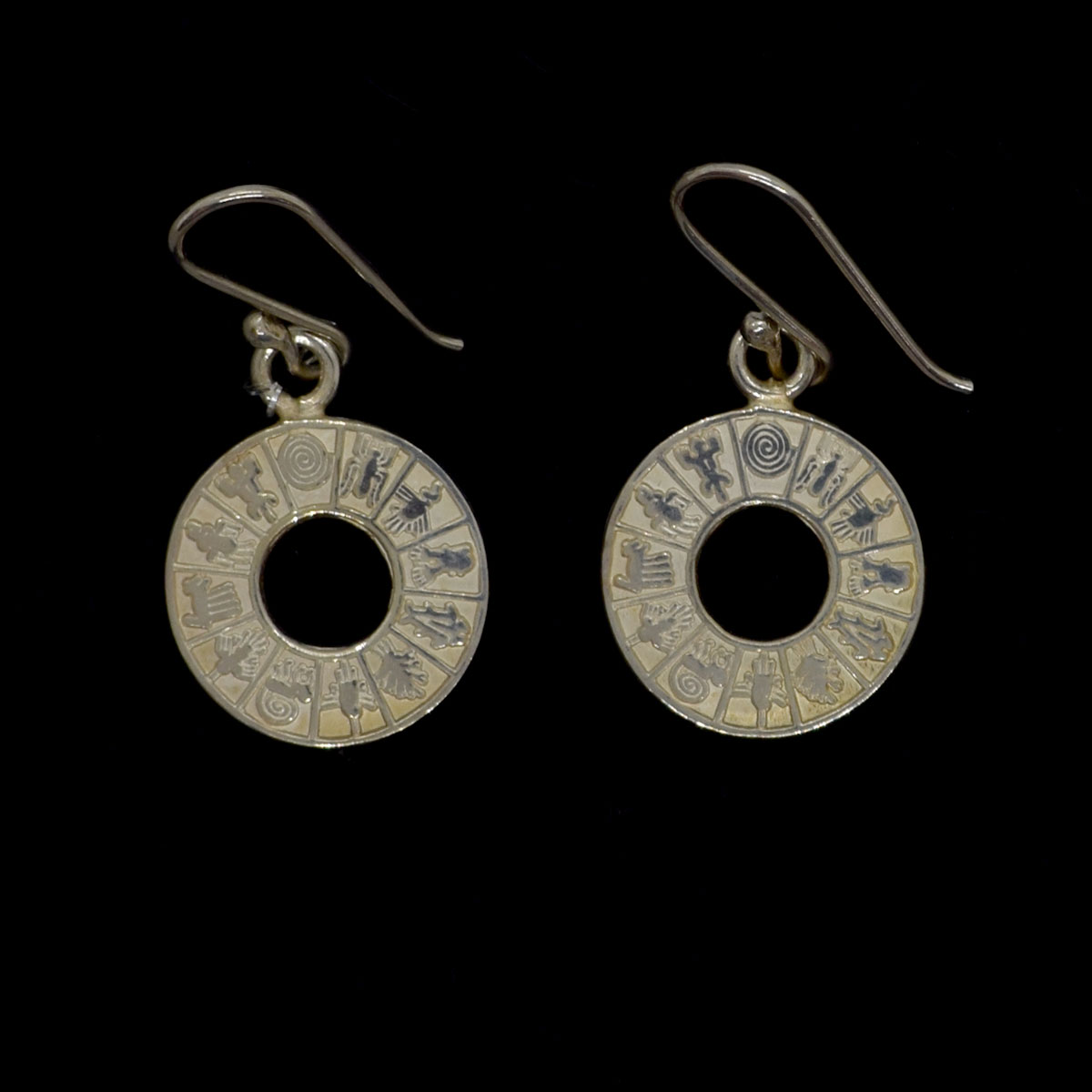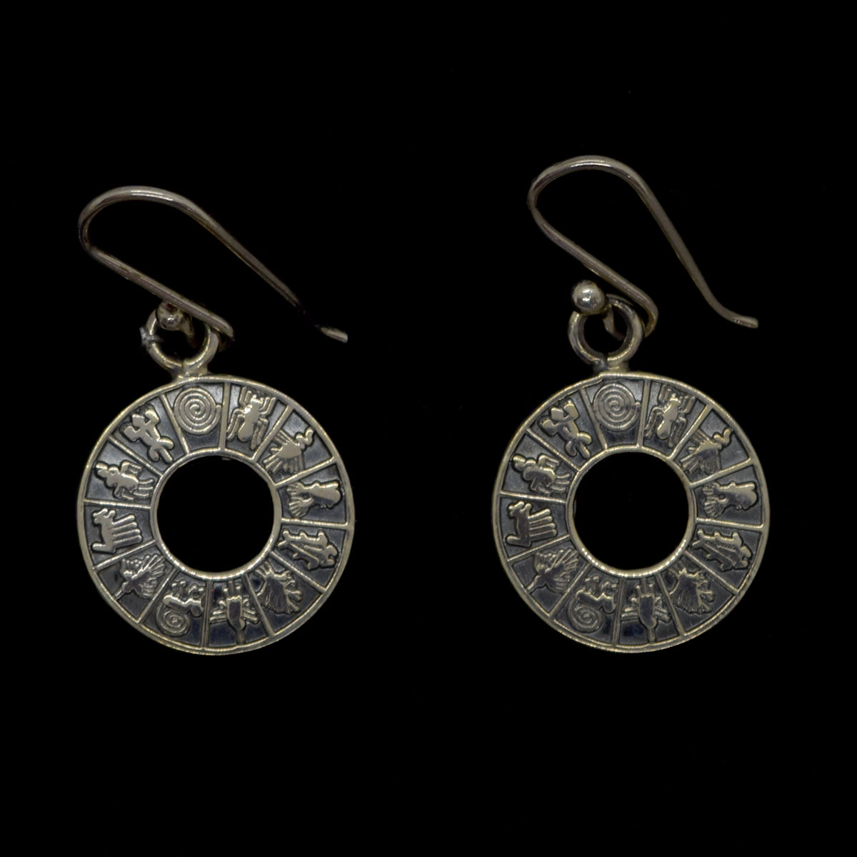 Nazca Calendar earrings made of 9.50 silver. It comes in two colors: light silver and dark silver. This Nazca calendar is based on the Peruvian Nazca lines, which are figures marked on the ground that represent various animals such as the hummingbird, the monkey, and the snake. The representation of these animals is superimposed on several other geometric lines and spirals. It is believed that the most remote drawings of the Nazca lines date from the time of the Paracas culture (seventh-second centuries BC), and the rest, from the Nasca period (first-sixth centuries AD).