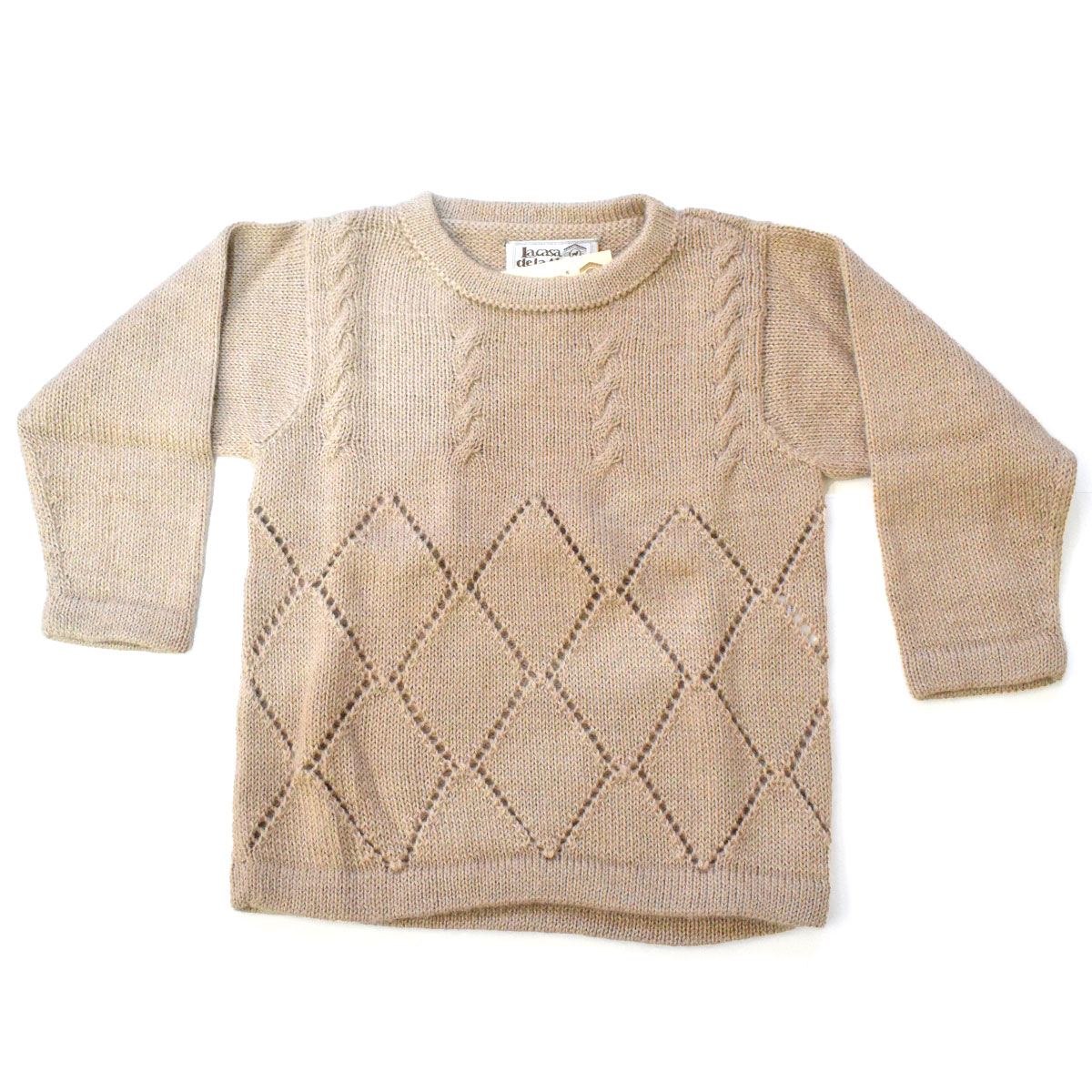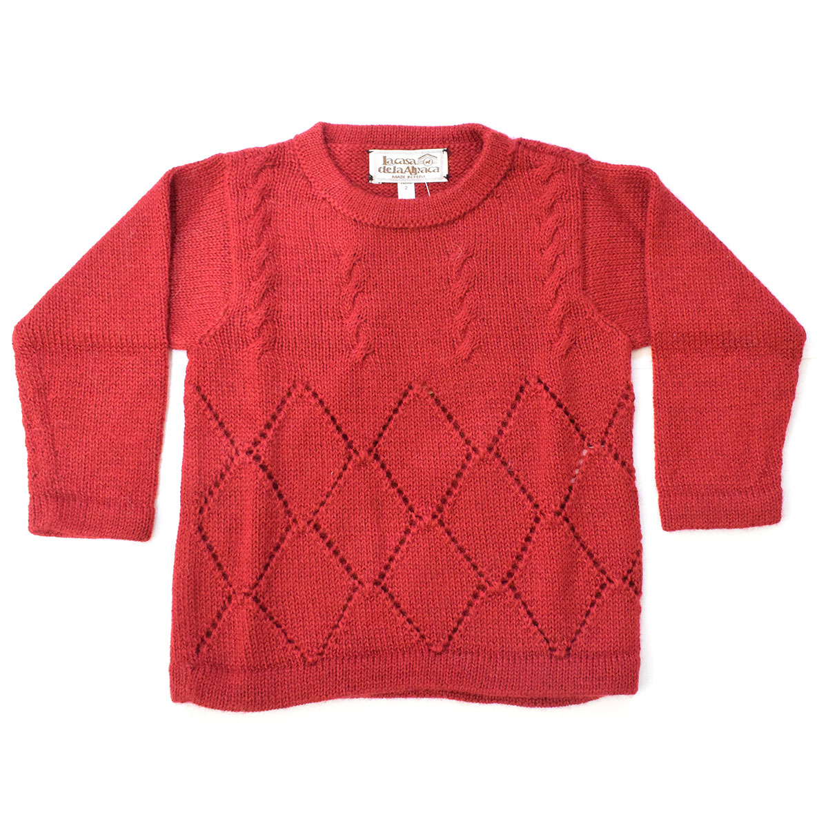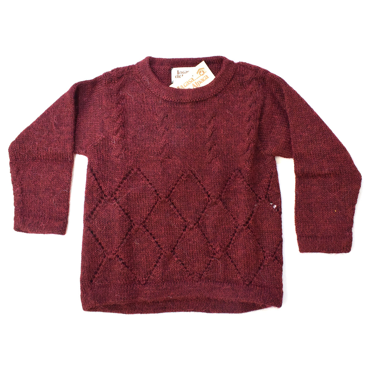 Crew neck jersey for boys made of 100% baby alpaca fiber. This lovely jersey has a little rhombus at the bottom of the jersey. The colors of these jerseys are amber, maroon, anthracite gray, peach, and red.