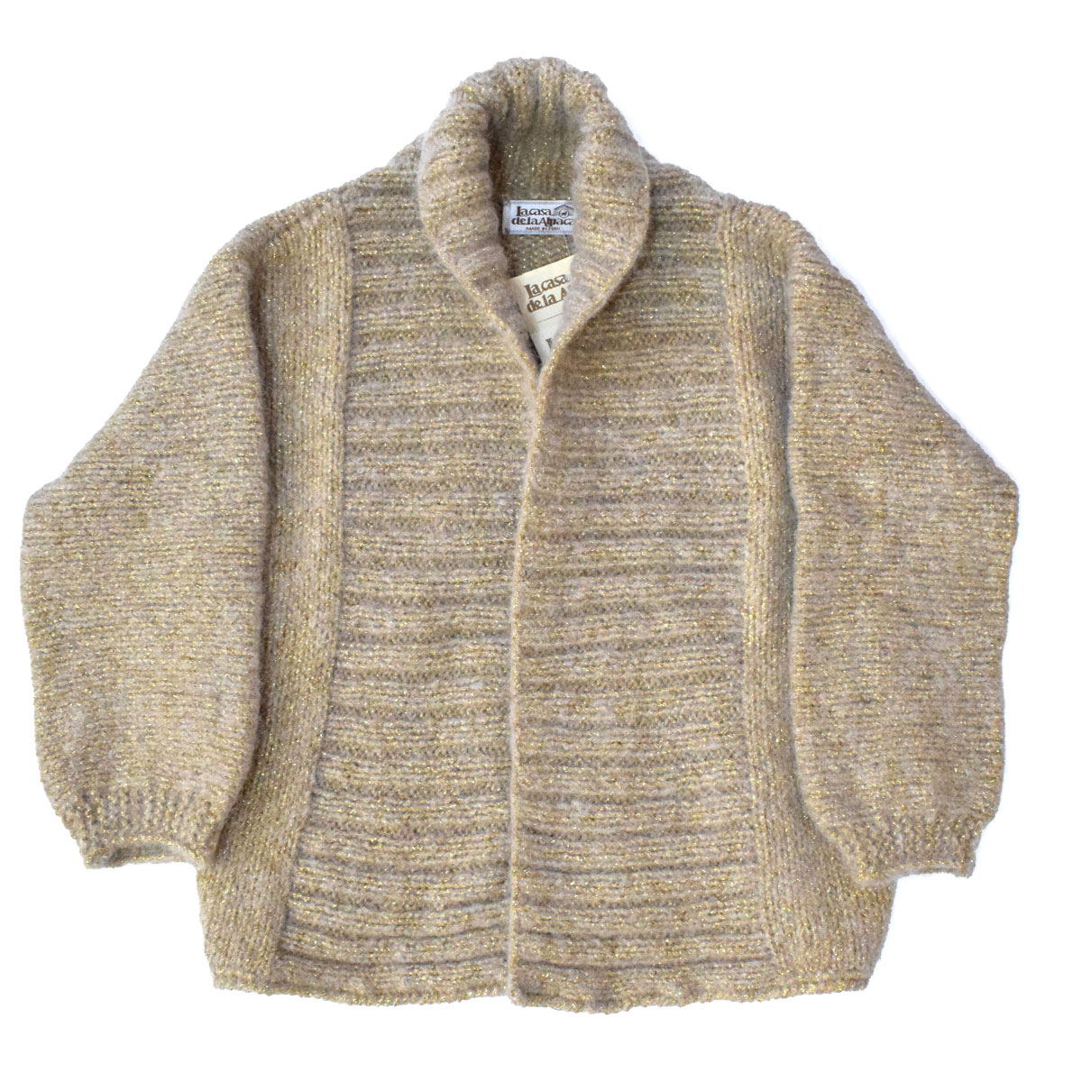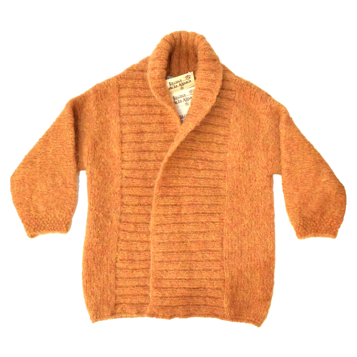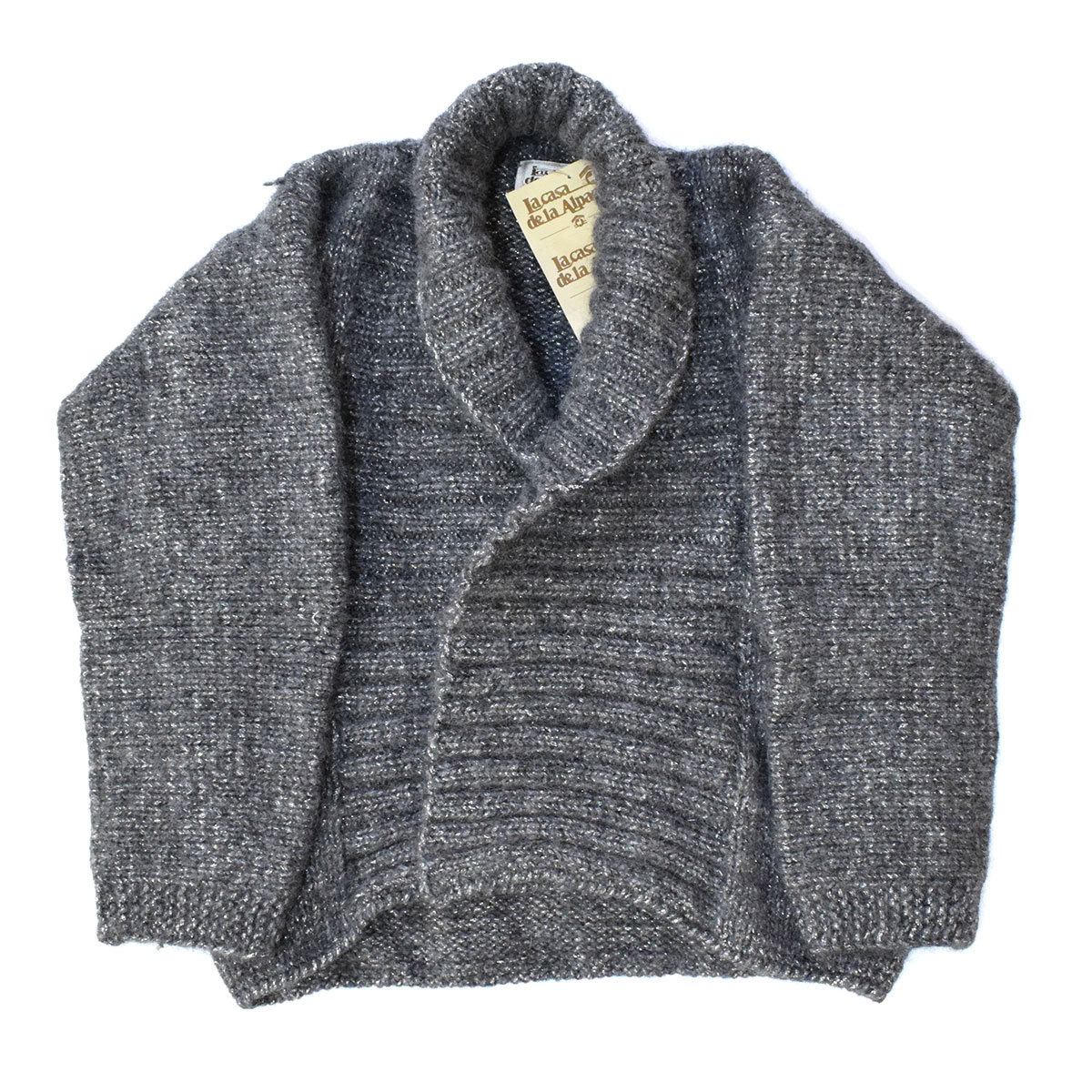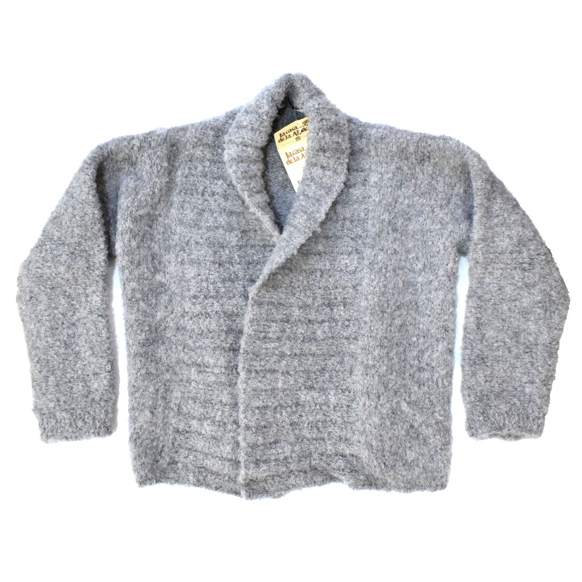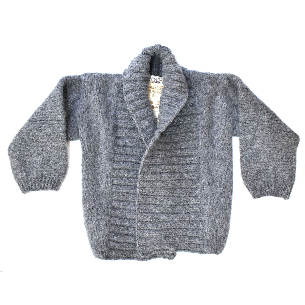 Open high neck knit cardigan for kids made of 100% baby alpaca. This cardigan comes in 5 colors: Grey light grey, sunset yellow, camel combined with gold, and dark grey combined with silver.