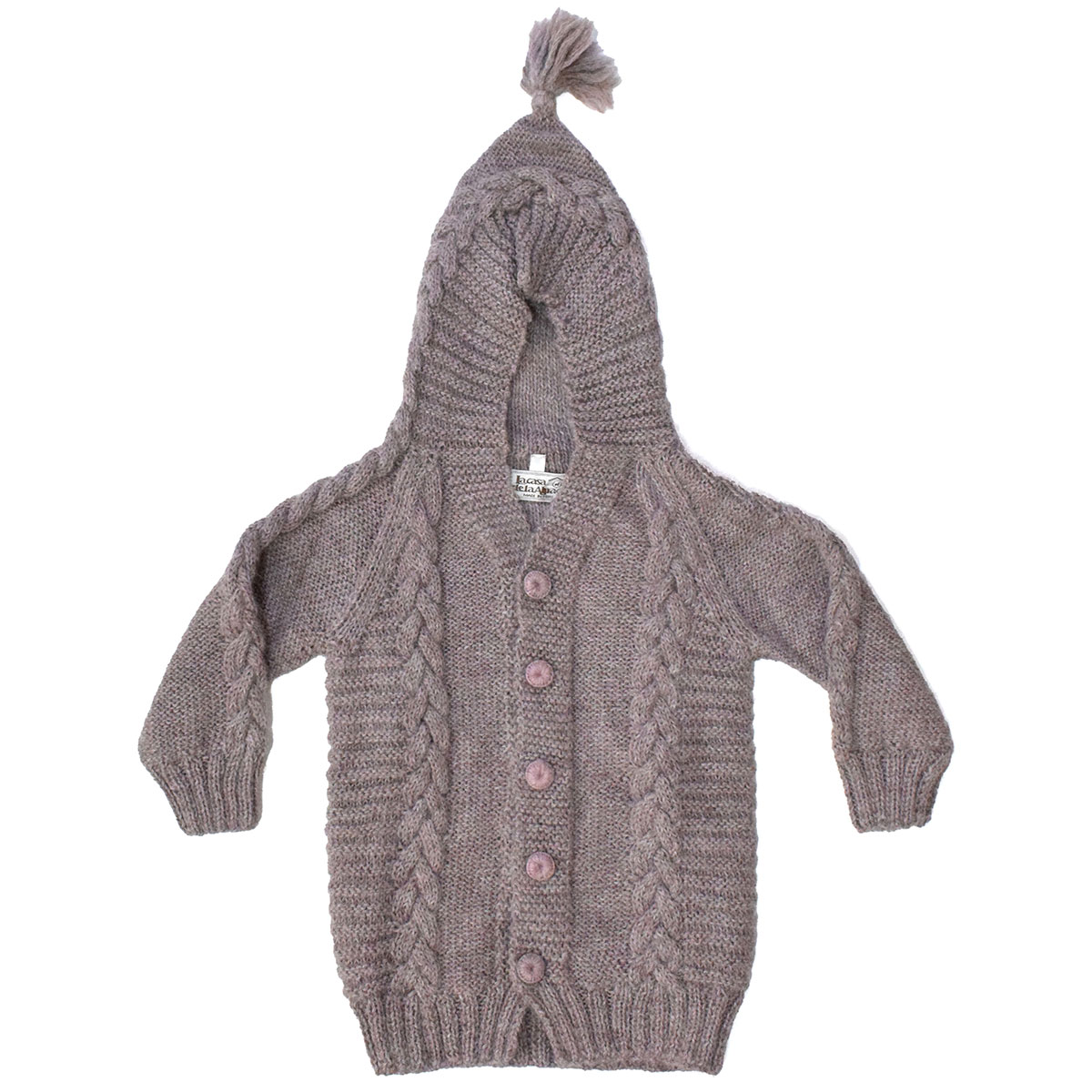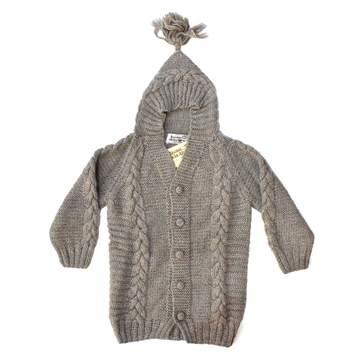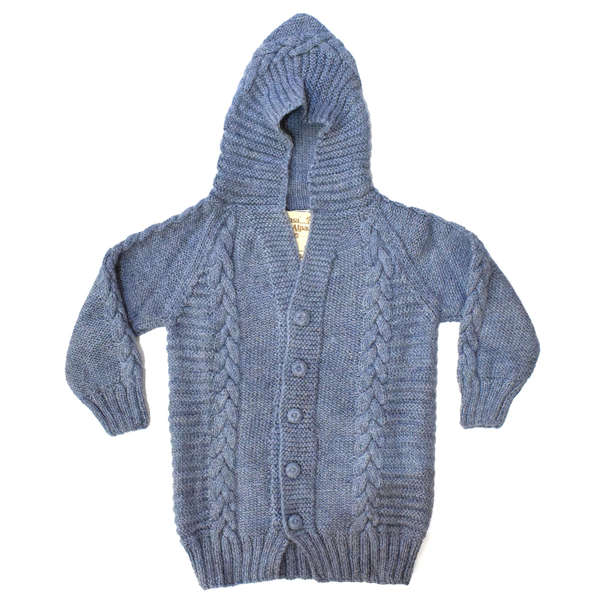Knit hooded cardigan for kids made of 100% superfine alpaca. This cardigan comes in steel blue, sand, and thistle.