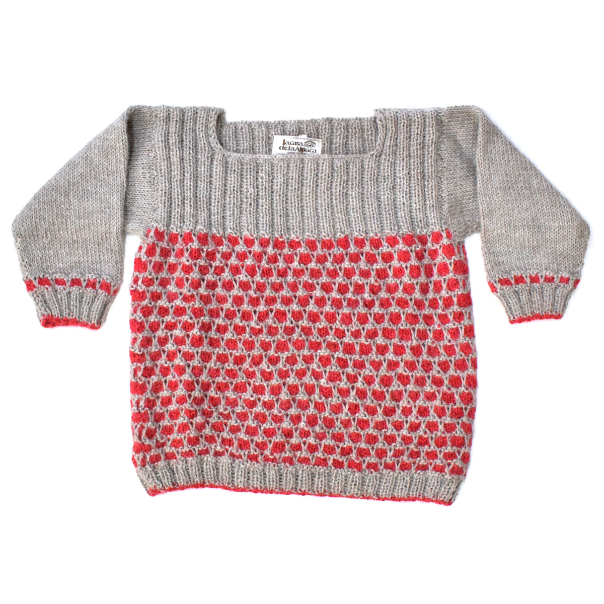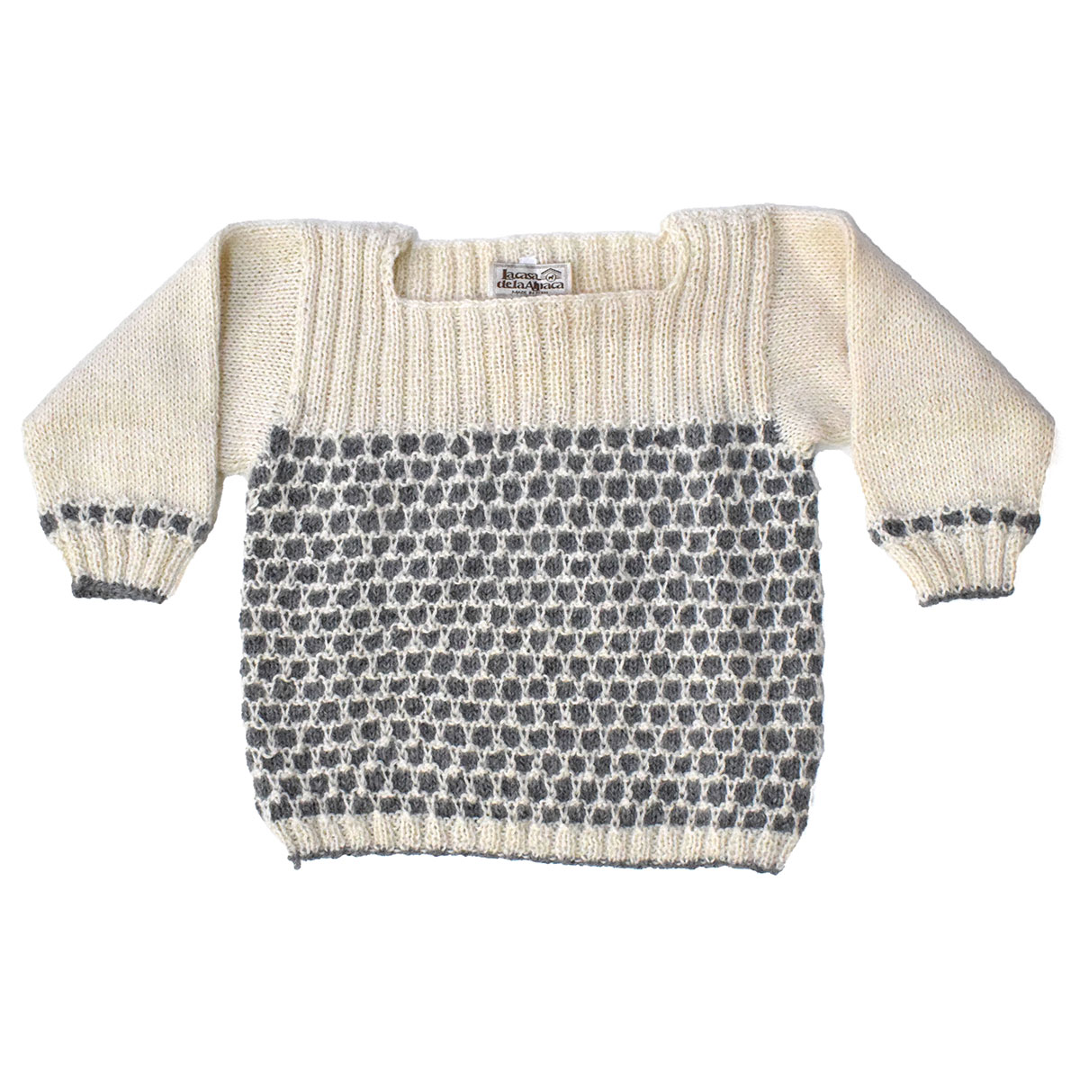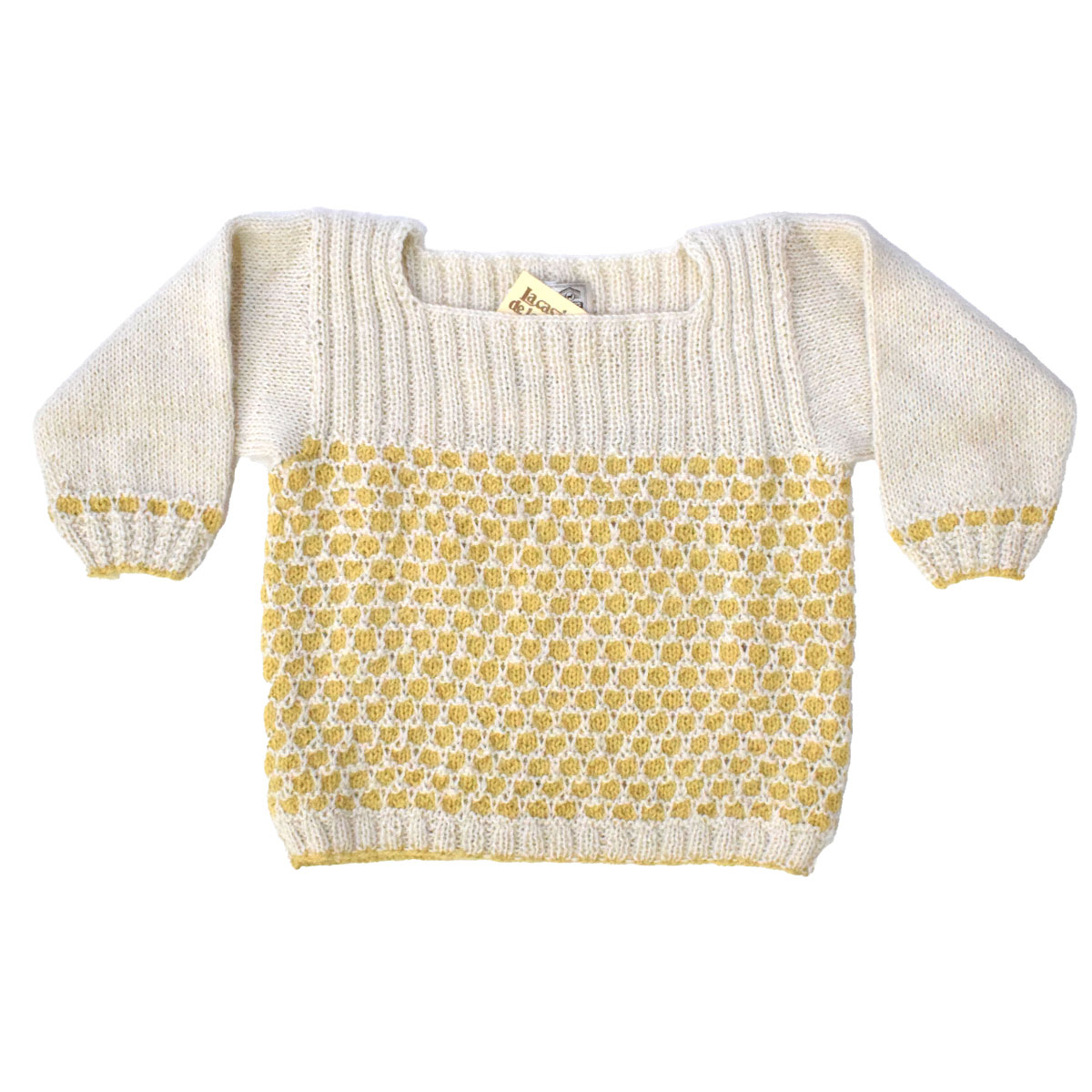Squareneck knit jersey for girls made of 100% baby alpaca fiber. This jersey comes in 3 colors: white bone combined with grey, mustard, and pink patterns.