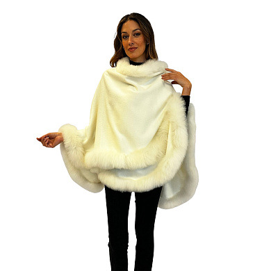 Feel maximum glamor with the short Maju cape made of the finest baby alpaca fabric and has a hand-sewn alpaca fur edge. It also has hidden hooks in the collar and cuffs so that the cape fits better on the body.