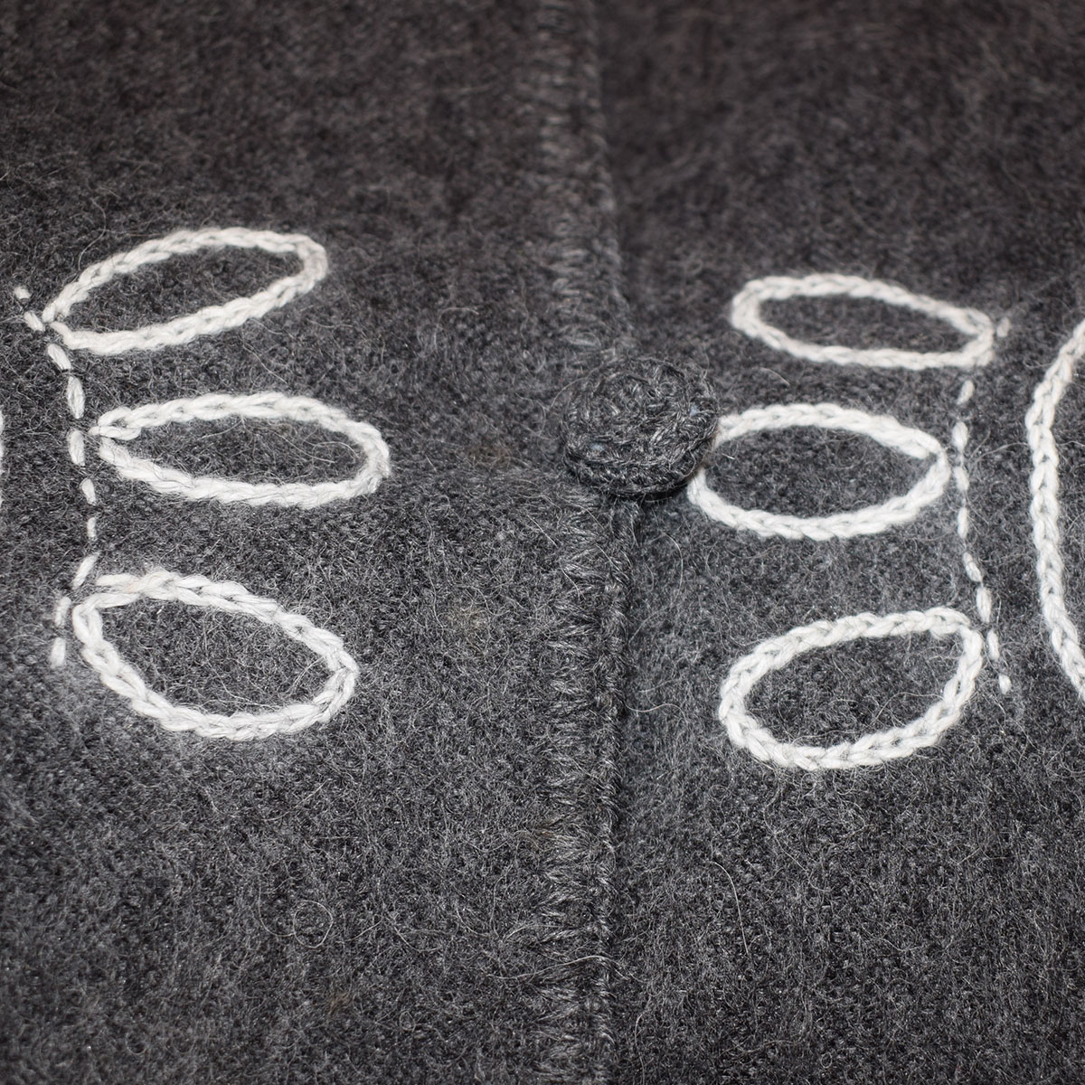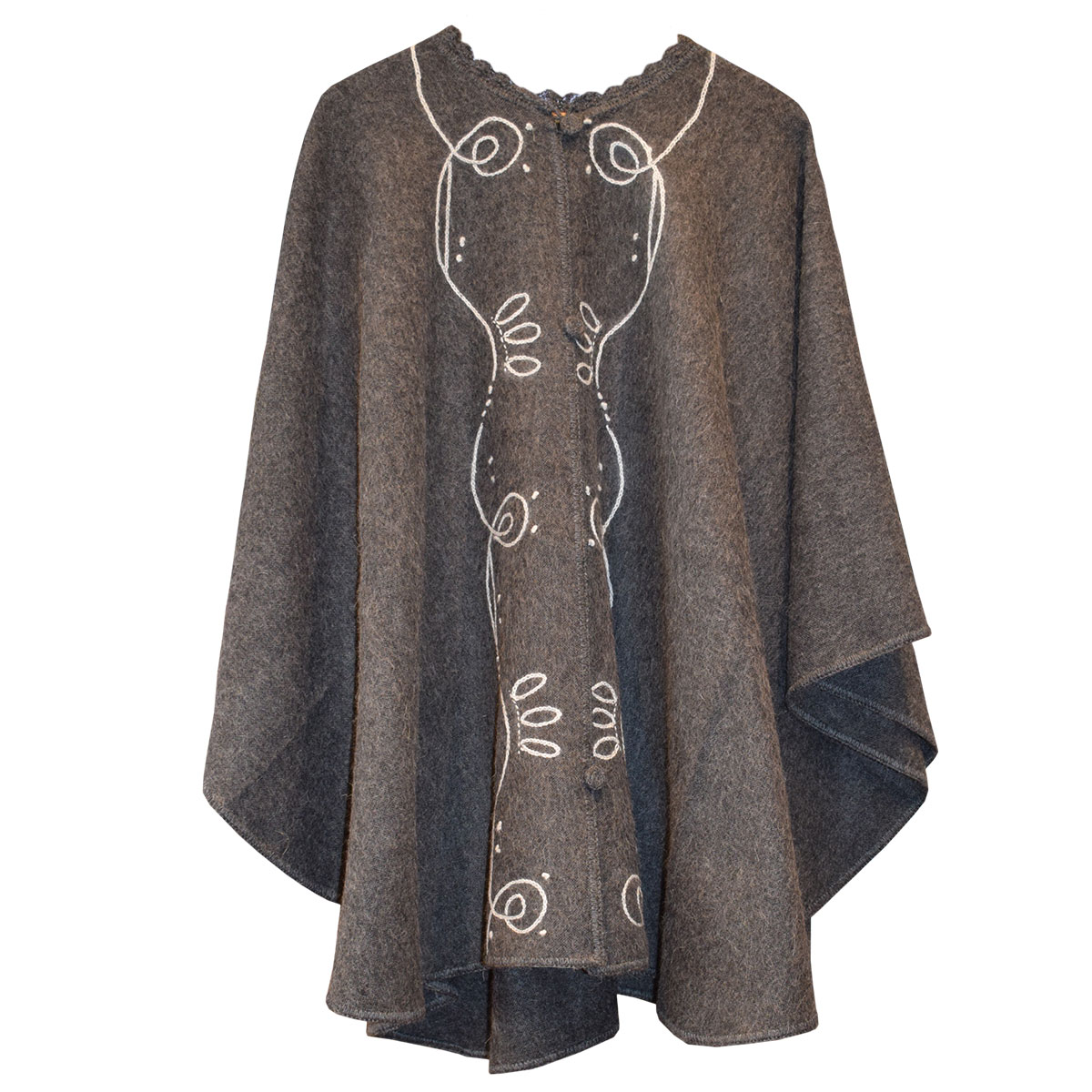 Loose-knit poncho with embroidered made of 100% alpaca fiber. Grey. It has buttons.
