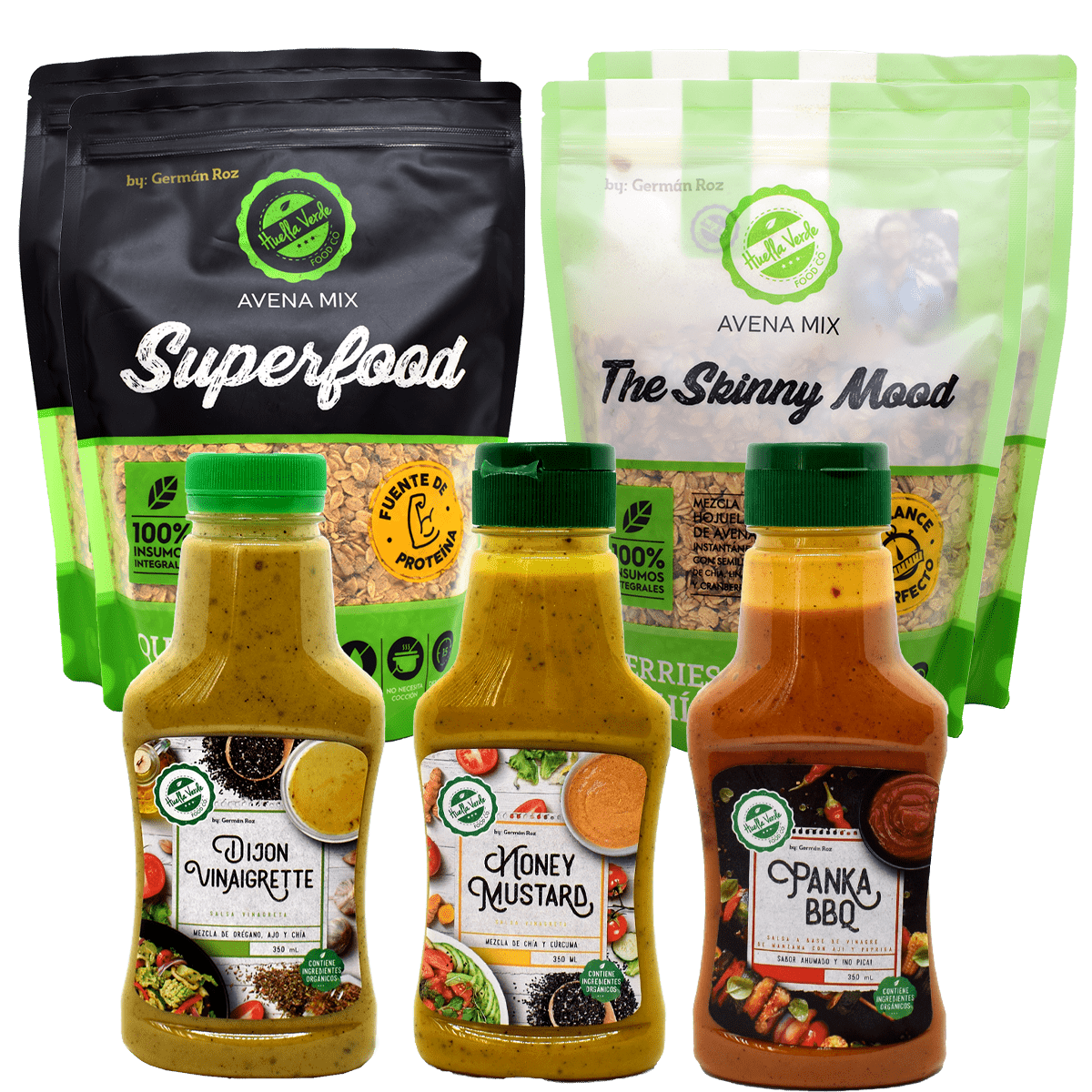Honey mustard, turmeric, and chia vinaigrette sauce. It is one of the emblematic sauces of Huella Verde. The mix between black pepper and turmeric enhances its medicinal properties. It also has chia, which provides protein and helps the digestion of fats and sugars. Its flavor with a sweet touch perfectly accompanies a salad, cooked vegetables, or a grill.