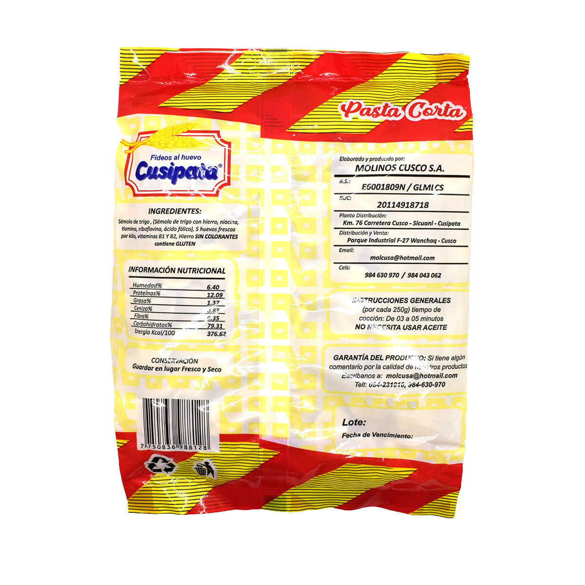 Cusipata noodles are made with the original recipe from more than one century ago. Its process is 100% natural. Each kilo contains more than five eggs, offering more protein and vitamins than traditional noodles. Enjoy this egg noodle with a tie shape. Cusipata was founded in 1921, in the District of Cusipata, Province of Quispicanchis located in Cusco at 3400 masl. The name refers to the town it belongs to, "Cusi" means "happy" or "happiness" and "Pata" means "place" or "space" and together it could be translated as "Place or space of joy."
