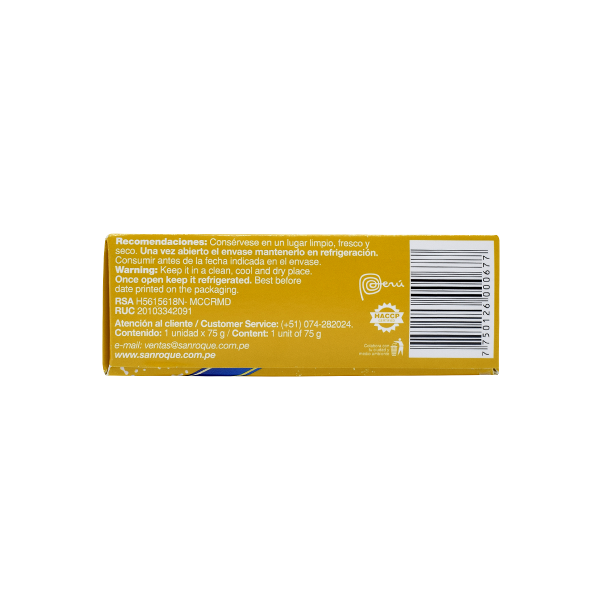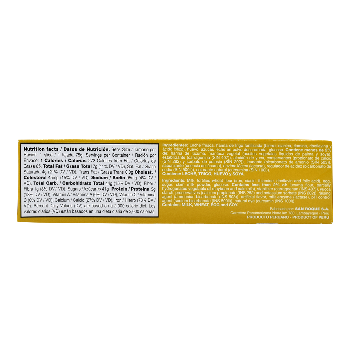 Milk, fortified wheat flour (iron, niacin, thiamine, riboflavin, and folic acid), egg, sugar, skim milk powder, and glucose. Contains less than 2% of: lucuma flour, partially hydrogenated vegetable oil (palm and soy), stabilizer (carrageenan (ISN 407)), yucca starch, preservatives (calcium propionate (ISN 282) and potassium sorbate (ISN 202)), raising agent (ammonium bicarbonate (ISN 503)), artificial flavor (lucuma essence), milk enzyme (lactase), pH control agent (sodium bicarbonate (ISN 500ii)), and natural dye (curcumin (ISN 110i))