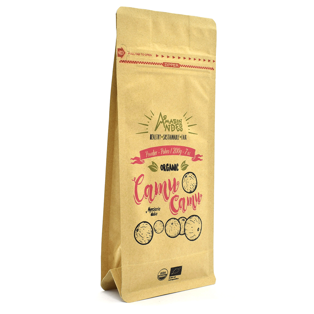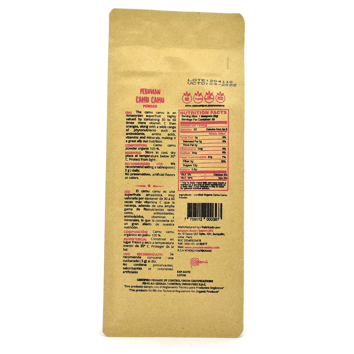 Myrciaria dubia M.H.K) is an Amazon superfruit highly valued for containing 30–60 times more vitamin C than oranges. Also, it contains a wide range of phytonutrients such as antioxidants, amino acids, vitamins, and minerals, making it a great ally of our nutrition. This fruit grows in the shores of Peruvian valleys, such as Ucayali, Marañon, Napo, Tigre, Curaray, Yavari, and Tahuayo. Organic camu camu powder is obtained through the selection of this fruit. After that, camu camu is washed, disinfected (following an organic process), pulped, cut, dried, ground, sieved, and packaged in a way that all its biological properties aren’t lost.