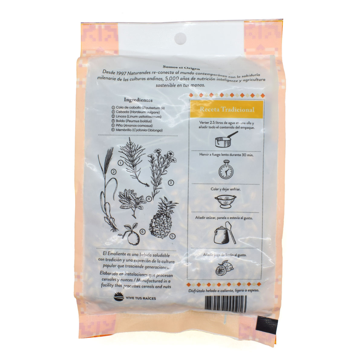 Since 1997 Naturandes reconnects the contemporary world with the ancient wisdom of the Andean cultures: 5,000 years of nutrition, intelligence, and agriculture in your hands. Emoliente is a healthy drink with tradition and an expression of popular culture that transcends generations. It has its origin in barley water, a very popular drink in Europe that arrived in Peru in the 17th century. Over the years, thanks to people and its extensive knowledge of the world of plants inherited from the ancient Peruvians, the drink has been transformed. This is how new ingredients are added: healing plants, powerful roots, and nourishing grains that give rise to the traditional Emoliente we know today. This Emoliente has ingredients like barley, flaxseed, boldo, dried pineapple, and quince. Emoliente is a herbal tea rich in vitamins and minerals such as iron, calcium, phosphorus, magnesium, and potassium. Plus, it's low in calories and has a natural source of fiber.