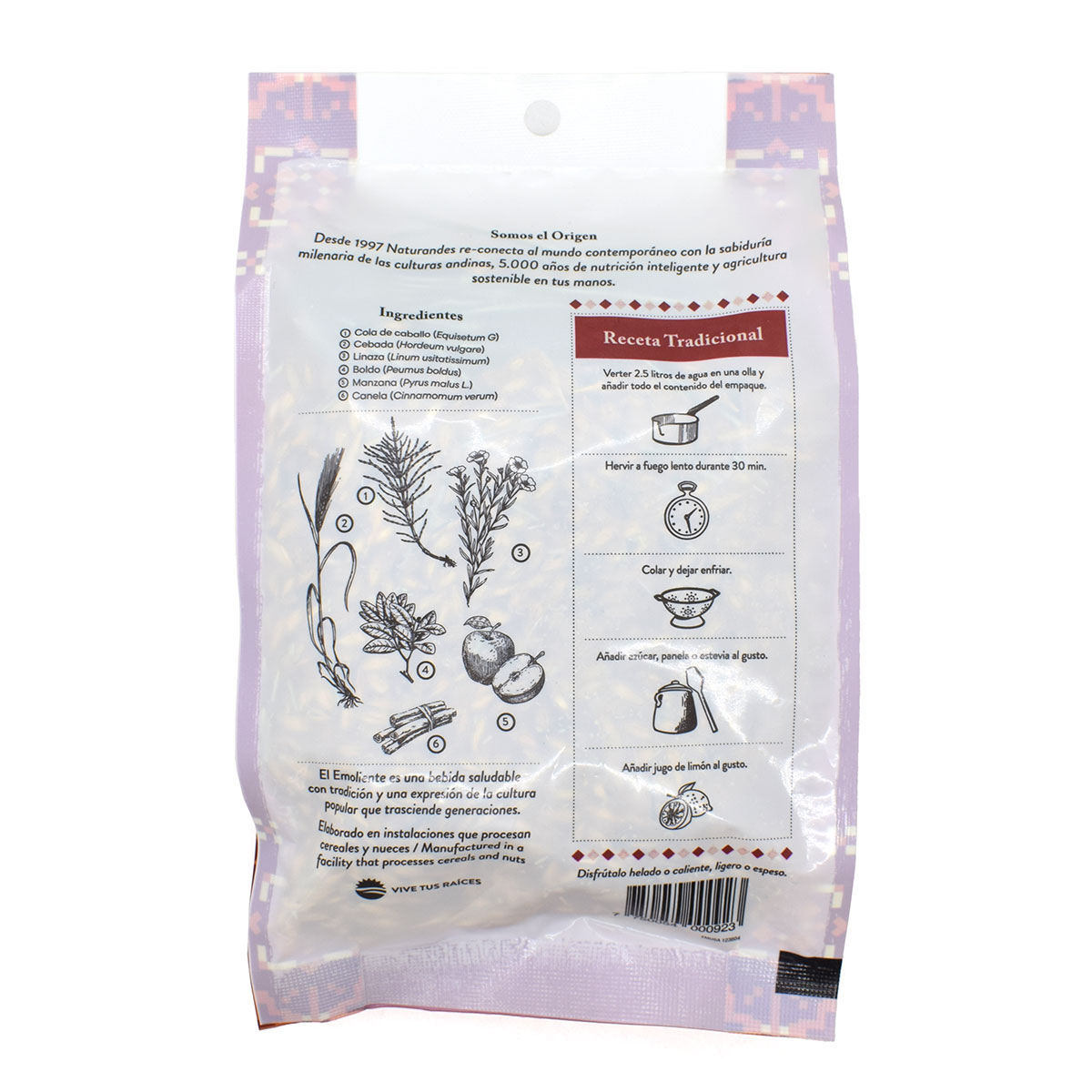 Since 1997 Naturandes reconnects the contemporary world with the ancient wisdom of the Andean cultures: 5,000 years of nutrition, intelligence, and agriculture in your hands. Emoliente is a healthy drink with tradition and an expression of popular culture that transcends generations. It has its origin in barley water, a very popular drink in Europe that arrived in Peru in the 17th century. Over the years, thanks to people and its extensive knowledge of the world of plants inherited from the ancient Peruvians, the drink has been transformed. This is how new ingredients are added: healing plants, powerful roots, and nourishing grains that give rise to the traditional Emoliente we know today. This Emoliente has ingredients like barley, flaxseed, boldo, dried apple, and cinnamon. Emoliente is a herbal tea rich in vitamins and minerals such as iron, calcium, phosphorus, magnesium, and potassium. Plus, it's low in calories and has a natural source of fiber.