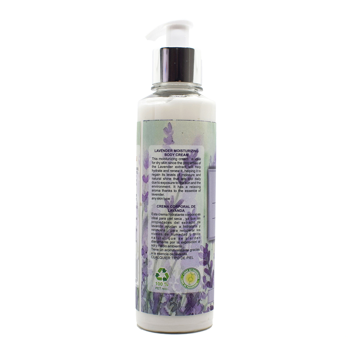 This body moisturizer is ideal for dry skin, since the properties of lavender extract help to hydrate and renew it to retain moisture levels and natural shine that are lost daily by exposure to the sun and the environment. It has a relaxing aroma thanks to the essence of lavender. INGREDIENTS Deionized water, coconut oil, vitamin E, cetyl alcohol, lavander extract, lavander essential oil, and microcare db RECOMMENDATION AND SUGGESTED USAGE: