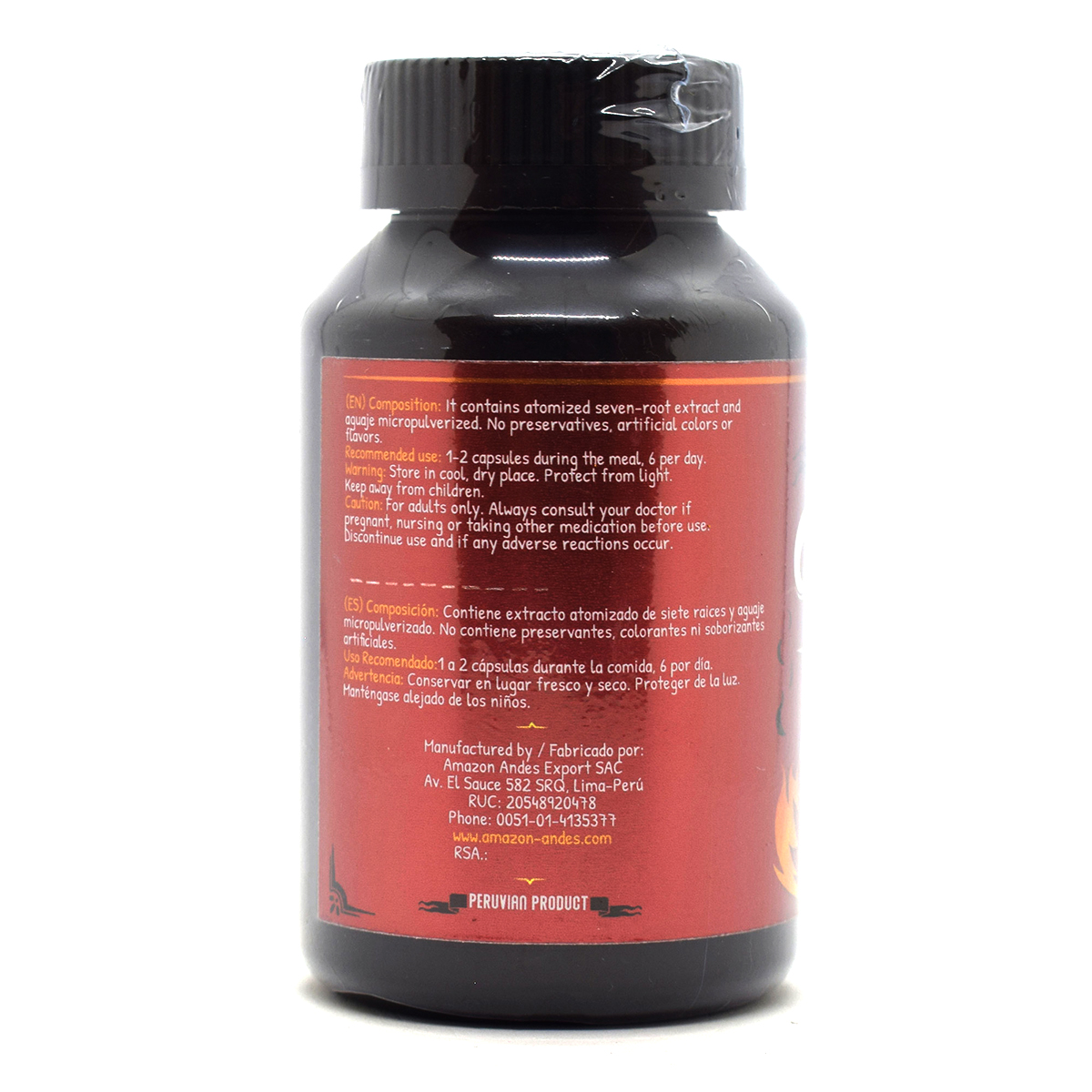 Aguaje powder, atomized extract of 7 roots (chuchuwasi, hanarpo hembra, red maca, icoja, murure, cumaceba, and clavo huasca), and vegetable capsule