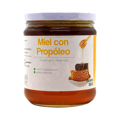 This is a mixture of pure bee honey with propolis. Propolis is a substance made by bees, it is a complex mix of resin, beeswax, essential oils, bee pollen, and viscous microelements. Bees use propolis outside the honeycomb to avoid the entrance of harmful bacterias. It contains a wide range of antibacterial properties, fructooligosaccharides, and micronutrients. Also, it regenerates the respiratory system. On the other hand, the honey bee has therapeutic, antimicrobial, and antiseptic properties.