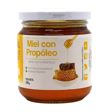 This is a mixture of pure bee honey with propolis. Propolis is a substance made by bees, it is a complex mix of resin, beeswax, essential oils, bee pollen, and viscous microelements. Bees use propolis outside the honeycomb to avoid the entrance of harmful bacterias. It contains a wide range of antibacterial properties, fructooligosaccharides, and micronutrients. Also, it regenerates the respiratory system. On the other hand, the honey bee has therapeutic, antimicrobial, and antiseptic properties.