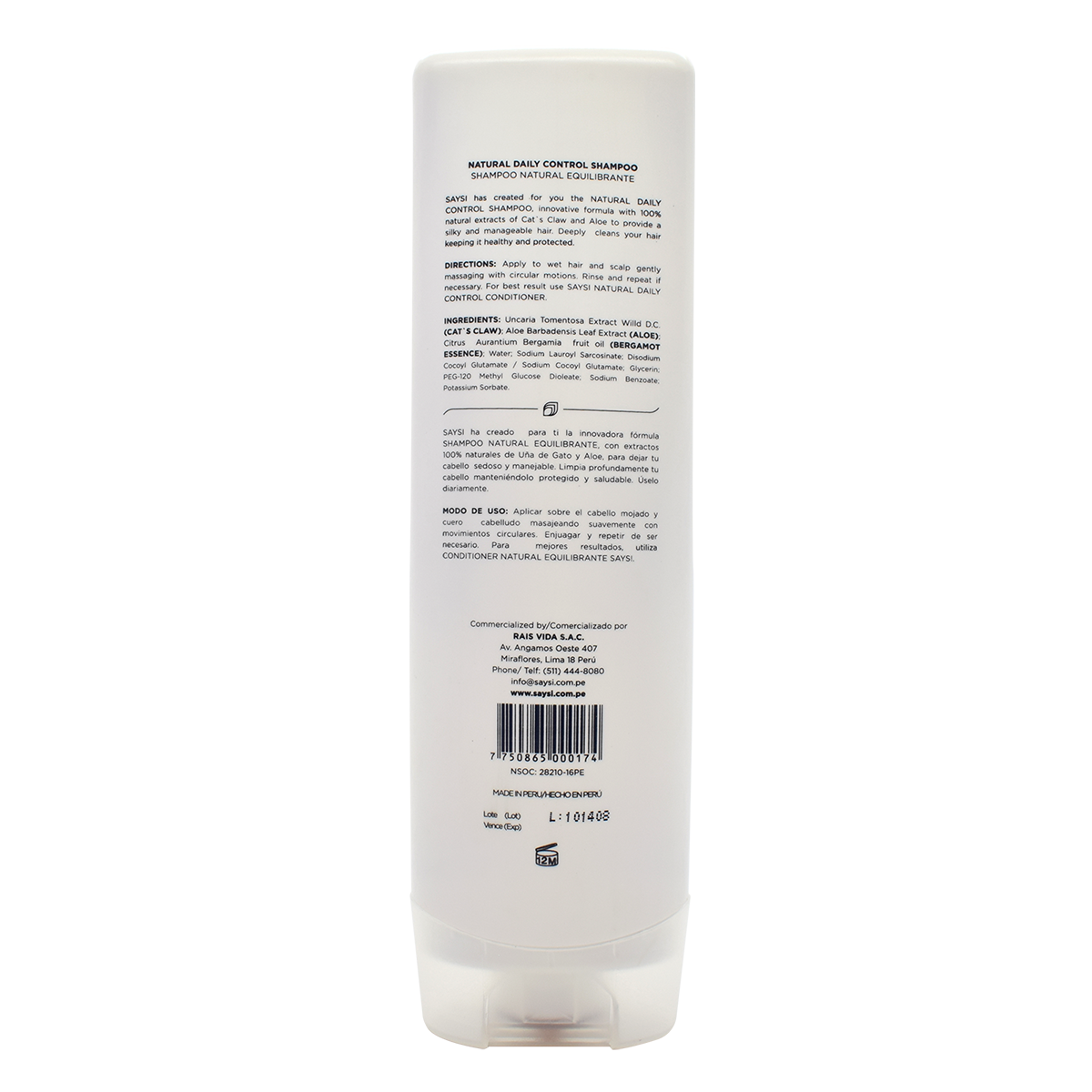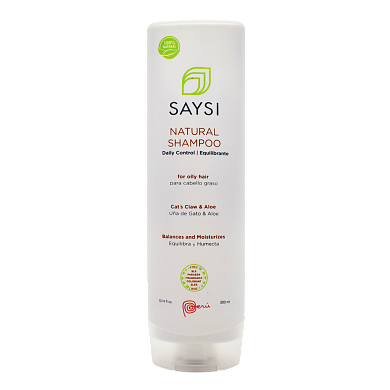 DESCRIPTION Right out of the Peruvian Jungle, cat's claw is a curative plant known to be the Amazon's miracle of herbal medicine. It's said that this herb fights off illnesses that attack our immunologic system. Likewise, aloe vera is a plant that many people in Peru use for the medicinal and healing properties that are attributed to it. The usage of this plant backs to human origins. Saysi has created for you the Natural Daily Control Shampoo innovative formula with 100% natural extracts of cat's claw and aloe to provide a silky and manageable hair. This shampoo deeply cleans your hair keeping it healthy and protected.