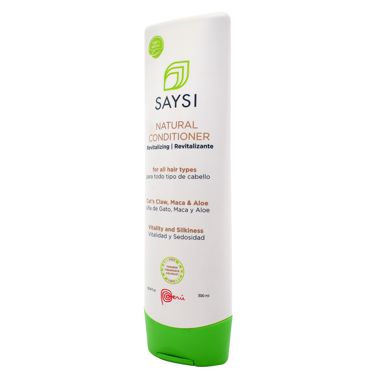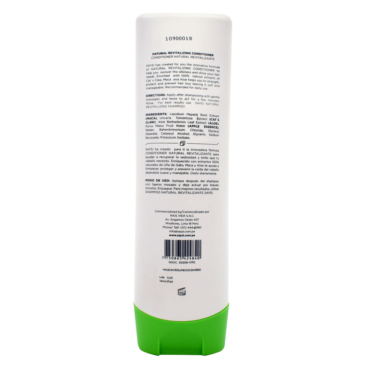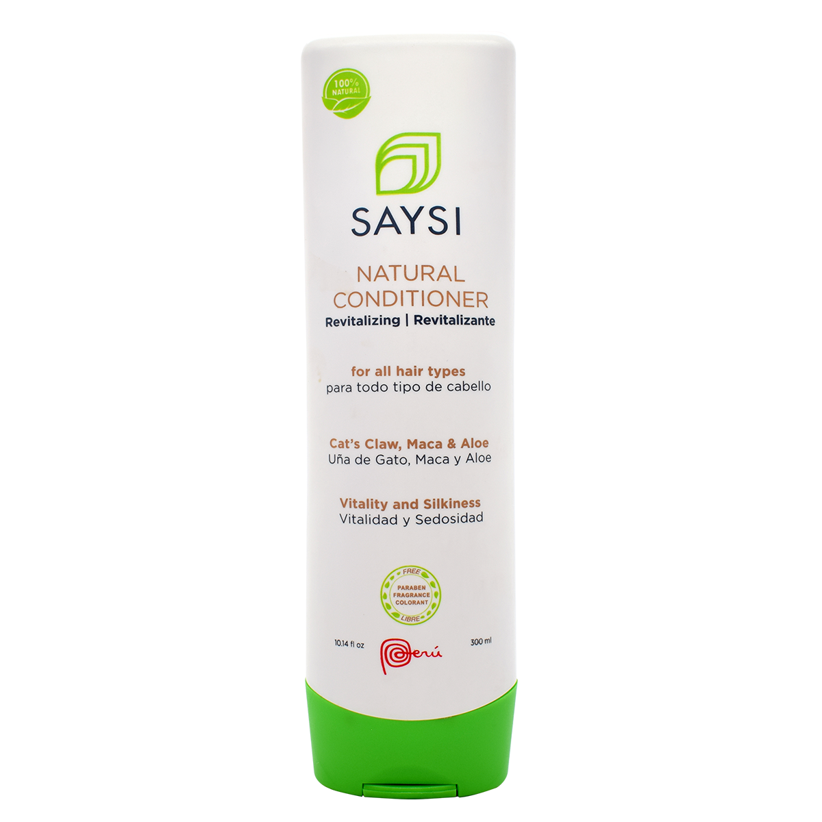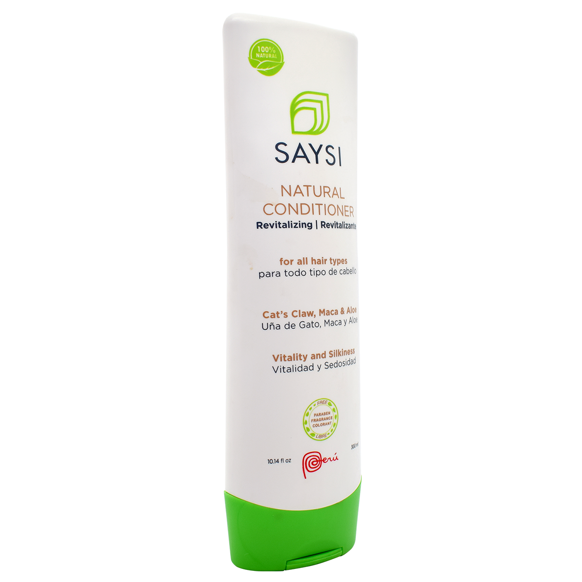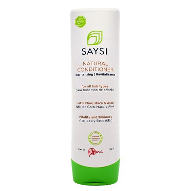 DESCRIPTION Right out of the Peruvian Jungle, cat's claw is a curative plant known to be Amazon's miracle of herbal medicine. It's said that this herb fights off illnesses that attack our immunologic system. Likewise, aloe vera is a plant that many people in Peru use for the medicinal and healing properties that are attributed to it. The usage of this plant backs to human origins. Additionally, maca is considered an ancestral superfood utilized since pre-Incan times for its protein content. Saysi has created for you the innovative formula Natural Revitalizing Conditioner to help you recover the silkiness and shine your hair needs. Enriched with 100% natural extracts of cat’s claw, maca, and aloe, this conditioner helps to strengthen, protect, and prevent hair loss leaving it soft and manageable. COMPOSITION Lepidium meyenii root extract (maca), uncaria tomentosa extract willd D.C. (cat’s claw), aloe barbadensis leaf extract (aloe), pyrus malus fruit water (apple essence), water, behentrimonium chloride, stearic acid, cetearyl alcohol, glycerin, sodium benzoate, and potassium sorbate RECOMMENDATION AND SUGGESTED USAGE: