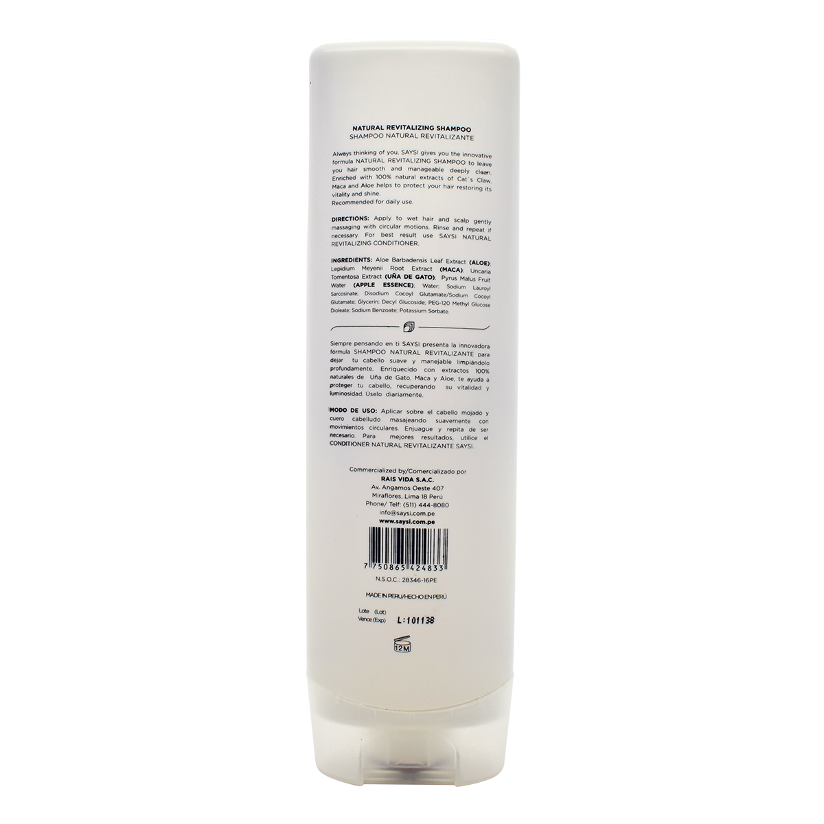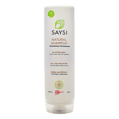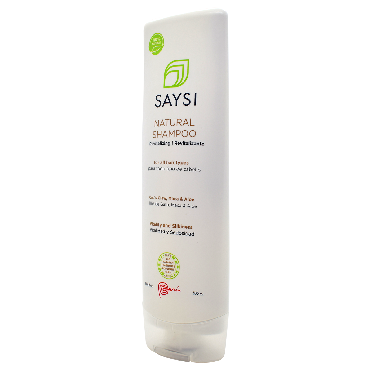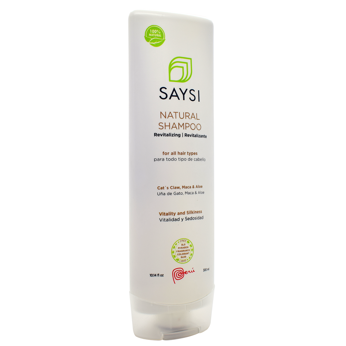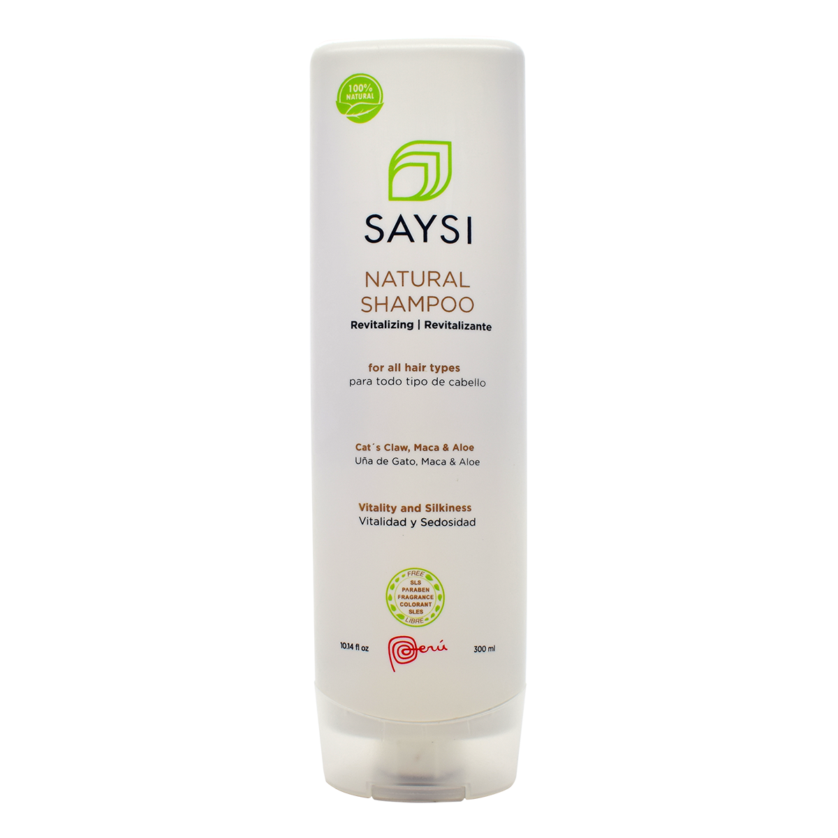 DESCRIPTION Right out of the Peruvian Jungle, cat's claw is a curative plant known to be Amazon's miracle of herbal medicine. It's said that this herb fights off illnesses that attack our immunologic system. Likewise, aloe vera is a plant that many people in Peru use for the medicinal and healing properties that are attributed to it. The usage of this plant backs to human origins. Additionally, maca is considered an ancestral superfood utilized since pre-Incan times for its protein content. Always thinking of you, Saysi has created the Natural Revitalizing Shampoo innovative formula to leave your hair smooth and manageable. Also, it will leave your hair deeply clean. Enriched with 100% natural extracts of cat’s claw, maca, and aloe, this shampoo helps to protect your hair by restoring its vitality and shine. COMPOSITION Aloe barbadensis leaf extract (aloe), lepidium meyenii root extract (maca), uncaria tomentosa extract willd D.C. (cat’s claw), pyrus malus fruit water (apple essence), water, sodium lauroyl sarcosinate, disodium cocoyl glutamate, sodium cocoyl glutamate, glycerin, decyl glucoside, PEG-120 methyl glucose dioleate, sodium benzoate, and potassium sorbate RECOMMENDATION AND SUGGESTED USAGE: