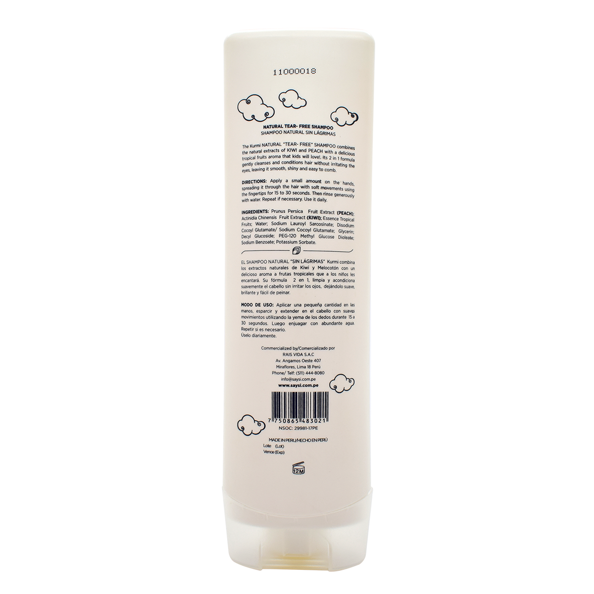 DESCRIPTION The Kurmi Natural “Tear-free” Shampoo combines the natural extracts of kiwi and peach with a delicious tropical fruit aroma that kids will love. It has a 2 and 1 formula that gently cleanses and conditions hair without irritating the eyes, leaving the hair smooth, shiny, and easy to comb. COMPOSITION Prunus persica fruit extract (peach), actinidia chinensis fruit extract (kiwi), essence tropical fruits, water, sodium lauroyl sarcosinate, disodium cocoyl glutamate/sodium cocoyl glutamate, glycerin, decyl glucoside, PEG-120 methyl glucose dioleate, sodium benzoate and potassium sorbate RECOMMENDATION AND SUGGESTED USAGE: