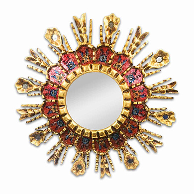 Round mirror with carved rays and glass painted on the reverse, mirror inlays and laminated in bronze leaf (gilt) and duco pasted on the back 100% HANDMADE